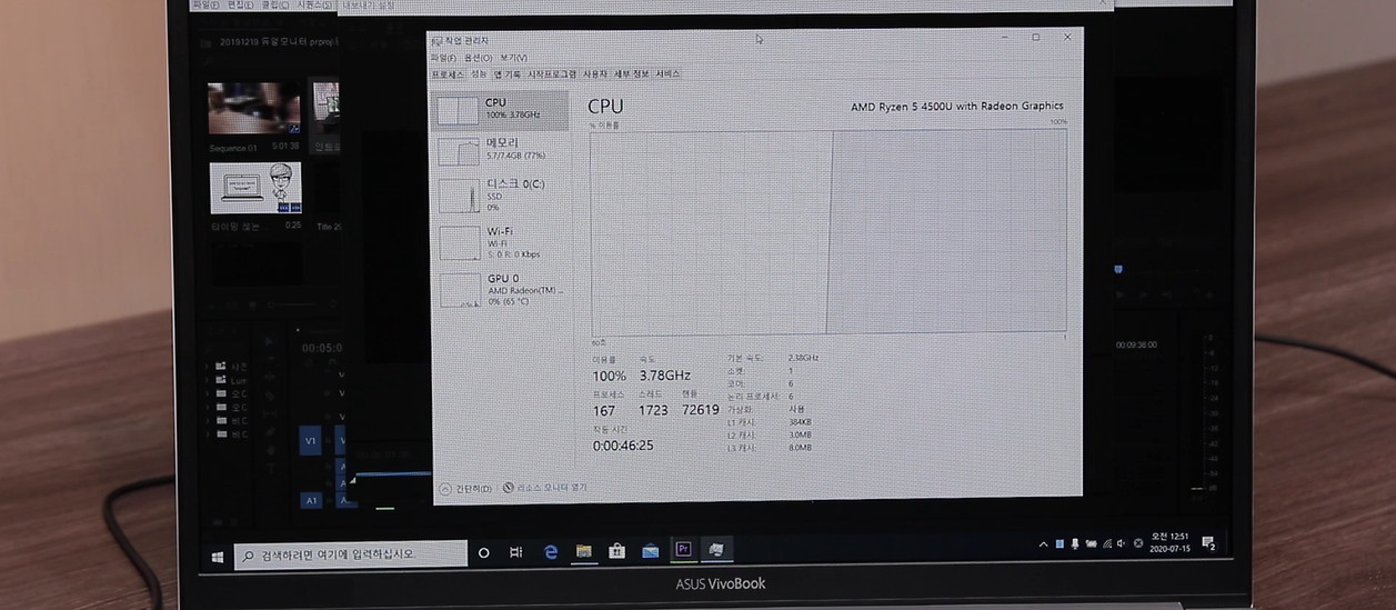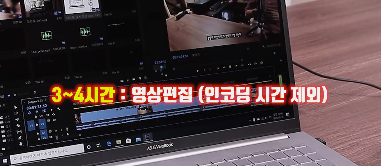 영상편집은 일반적으로 유튜브에 올리는 FullHD 화질, 간단한 수준의 편집은 충분합니다. 하지만 영상 길이가 길어 데이터양이 많거나 화려한 전환 효과 혹은, 애프터 이펙트를 사용 할 정도의 영상 편집은 힘듭니다. 내장 그래픽의 한계가 분명히 있죠.