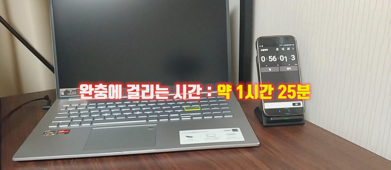 충전기가 45W라서 충전이 느리지는 않을까 걱정했었는데 그런 거 전혀 없습니다. 완충에 걸리는 시간이 약 1시간 25분 정도로 65W 충전기를 사용하는 노트북들과 크게 다르지 않습니다.
