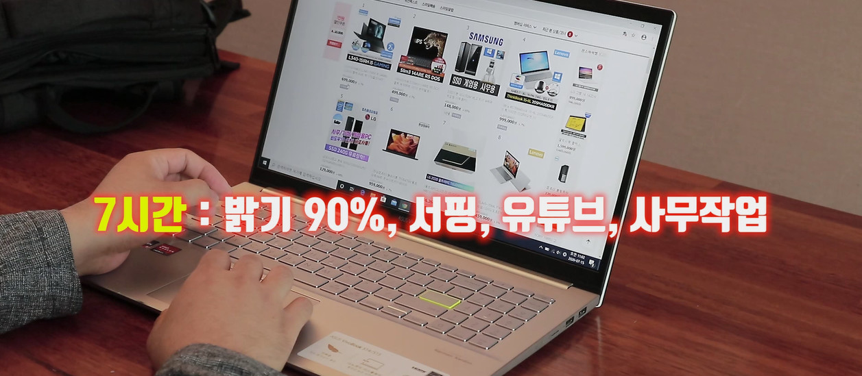 물론 밝기를 50% 설정해서 사용하는 것은 현실적으로 불가능하고, 제가 밝기 90% 놓고 사용해 봤는데 일반적인 서핑이나 유튜브 문서작업 위주로 사용하면 7시간 정도 사용 가능했습니다. 이 7시간도 굉장히 높은 수치의 사용시간으로 휴대용 저전력 노트북으로써의 사용성이 아주 좋다고 평가할 수 있습니다.