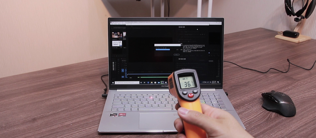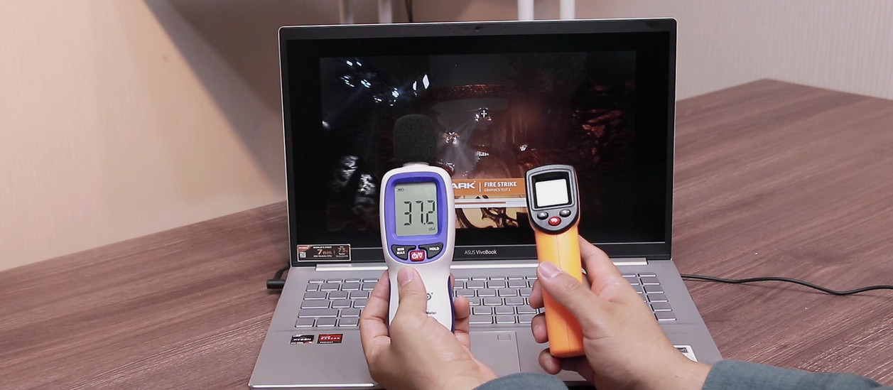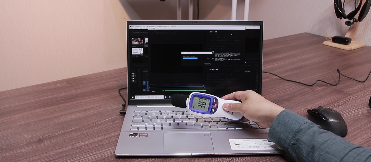 제가 소음기와 온도 체크기로 측정을 하려는데 라이젠 4500U를 사용하는 노트북들은 이 측정 기기의 사용이 큰 의미가 없습니다. 노트북 자체가 많이 뜨거워 지지 않고, 그로인해 팬도 그렇게 쌔게 돌지 않습니다.