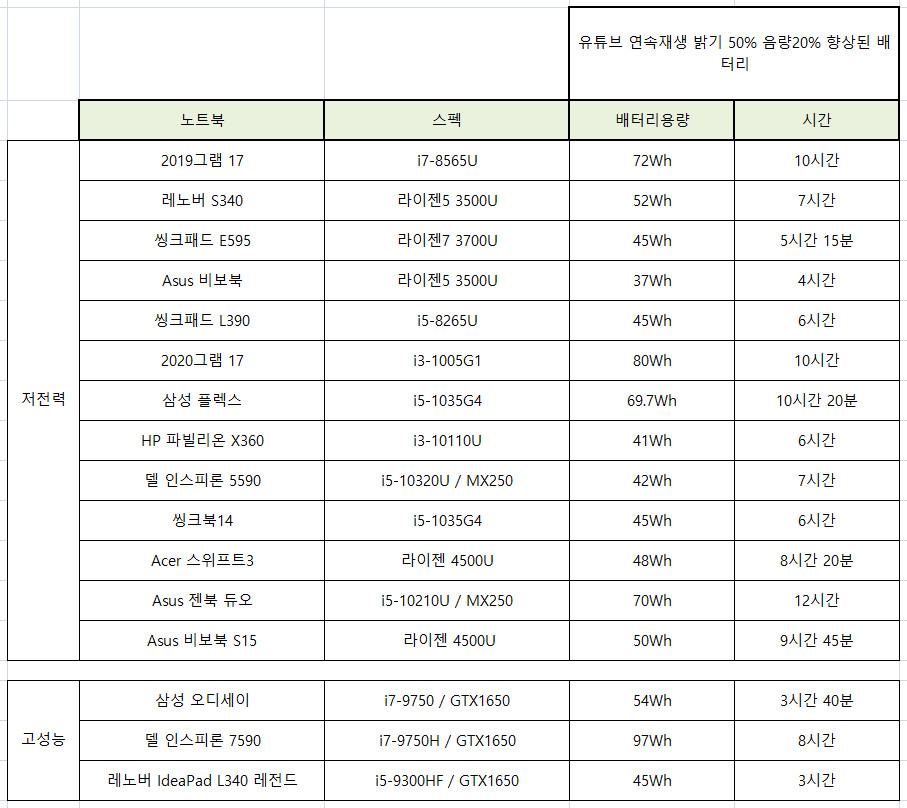 배터리 사용시간은 사용자의 사용 환경에 따라 오차범위가 넓습니다. 그렇지만 최대 사용시간이 길다는 것은 내가 특정한 환경에서 긴 배터리 타임이 필요할 때 굉장히 큰 장점으로 다가올 수 있습니다. 쉽게 말해 노트북을 휴대하면서 사용할 때 어떠한 변수가 있을지 모르기 때문에 최대 사용시간이 긴 것이 무조건 유리하다는 거죠.