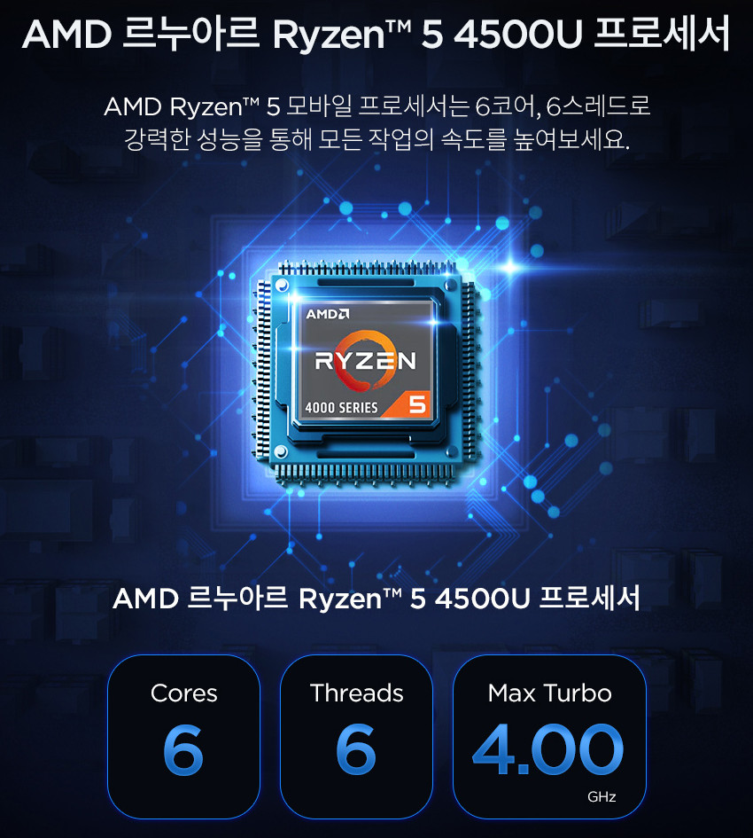 AMD 라이젠 4500U의 CPU는 지금까지의 저전력 CPU중 가장 좋습니다. 다른 말이 필요 없죠. 성능 좋고, 발열 낮고 그냥 최고입니다. 요즘 영상에 반복적으로 설명을 하고 있기 때문에 CPU에 대한 내용은 생략하겠습니다.