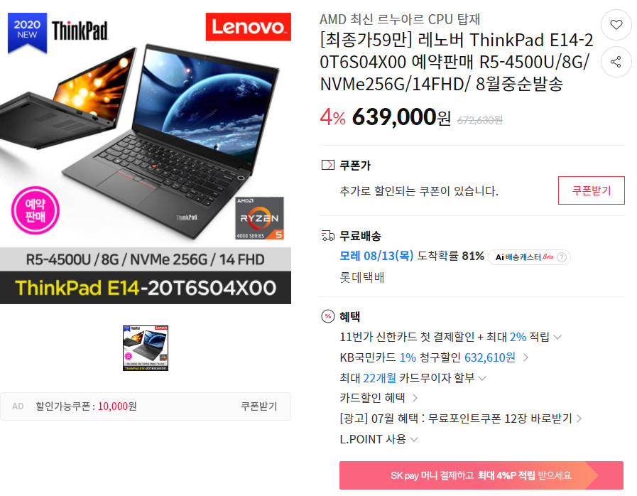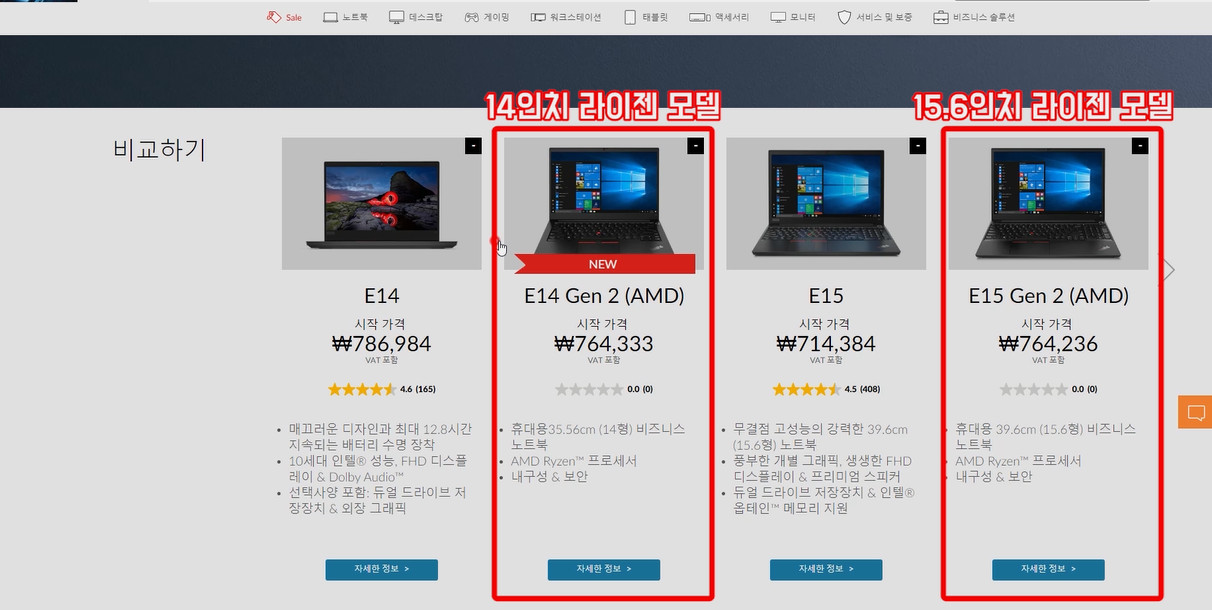 레노버 씽크패드 중 가장 저렴한 보급형 라인인 E시리즈에 AMD 4500U가 탑재되어 나옵니다. 레노버 공식 홈페이지에서도 확인 가능하며 우리나라에서는 14인치의 E14 모델 먼저 예약판매에 들어갔습니다. 15.6인치의 E15는 다음주에 예약 판매를 시작한다고 하니 먼저 예약 판매 하고있는 14인치 기준으로 살펴보겠습니다.