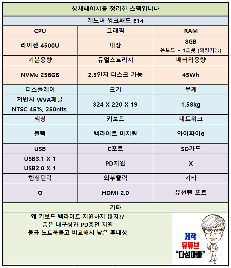 그럼에도 불구하고 PD충전 지원, 높은 내구성, 울트라나브 키보드와 보급형이긴 하지만 씽크패드라는 네이밍까지, 구매 할 가치는 충분히 있다고 생각합니다.