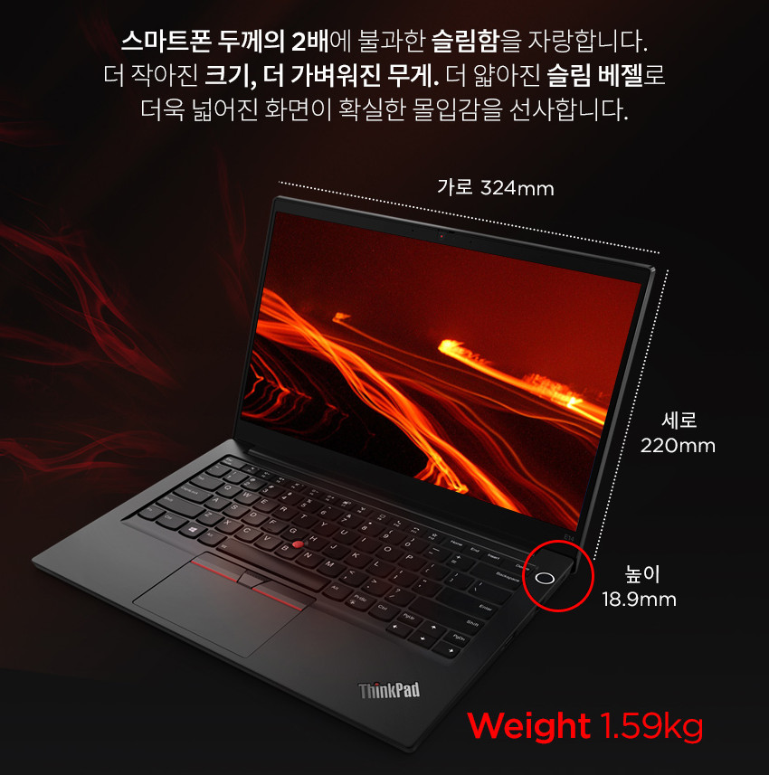 동급의 다른 노트북들 대비 좀 더 크고 무거운 것은 일반적인 소비자들이 씽크패드 보급형 라인을 꺼려하는 이유입니다. 이번 모델 역시 전 모델 대비 좀 더 경량화가 되었지만 그렇게 가볍거나 작다고 볼 수는 없습니다. 그냥 휴대하기에 불편하지 않은 정도, 혹은 무난한 정도, 이정도로 보시면 되겠네요.