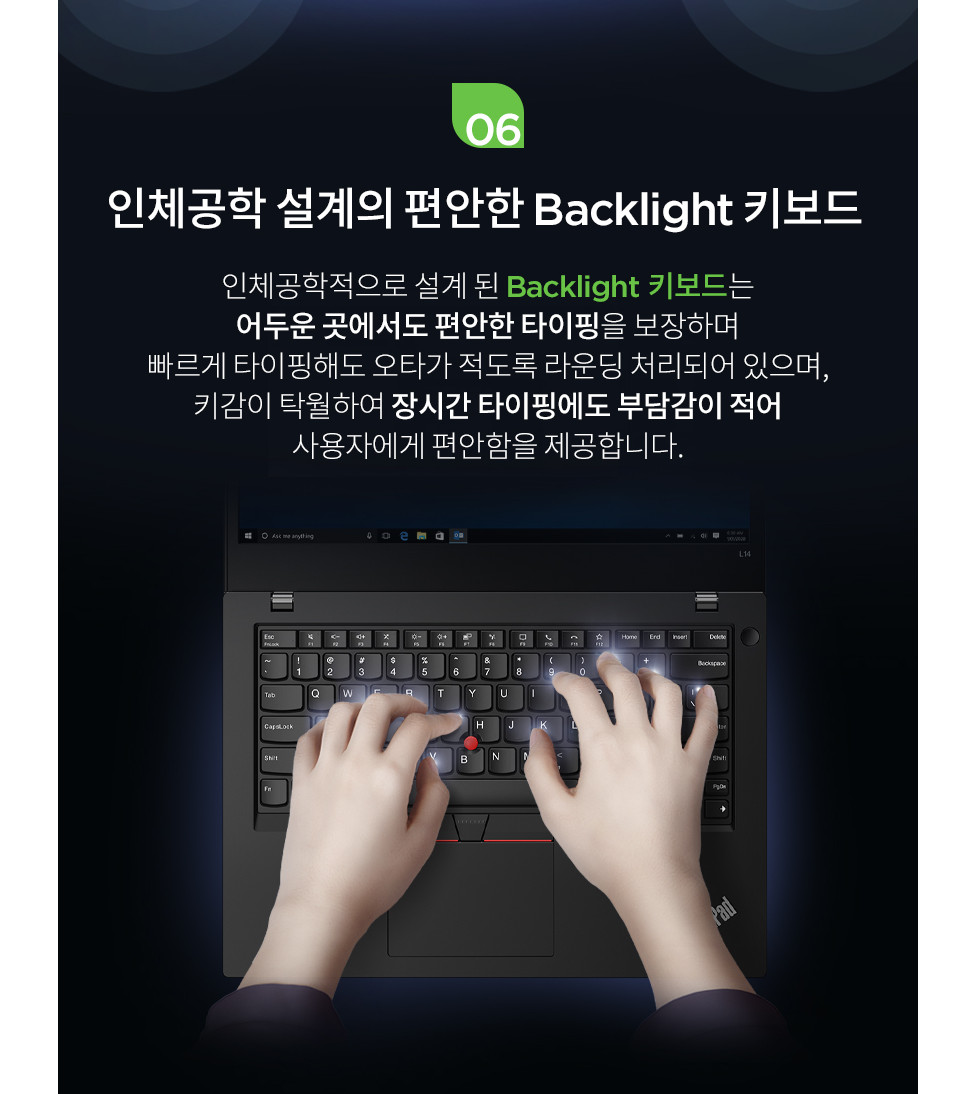 씽크패드의 자랑인 키보드입니다. 가장 완벽한 노트북 키보드로 평가받고 있으며 E시리즈 라이젠 모델과 다르게 백라이트 키보드를 지원하고 있습니다.