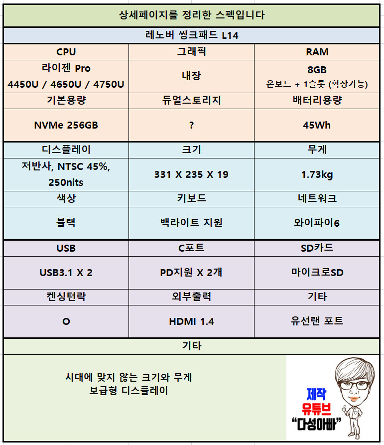그래서 저는 완전히 다르게 생각해서 가장 저렴한 라이젠3 4450U를 추천합니다. 이유는 간단합니다. 들어가는 비용 대비 효율이 가장 좋기 때문이죠. 씽크패드의 감성을 그대로 느끼면서 4코어 8쓰레드로 사양은 결코 떨어지지 않고 PD충전 지원 가능한 C포트를 2개나 사용 가능하고 사용성 높은 키보드에는 백라이트가 들어오며 상업용 사용에 강한 튼튼하고 매력적인 씽크패드를 사용할 수 있습니다. 70만원에 가능하죠. 이렇게 접근하면 색재현율 45% 밝기 250nits의 보급형 디스플레이가 그렇게 큰 불만이 되지 않습니다. 오히려 저렴하게 구매했기 때문에 만족도가 증가하죠.