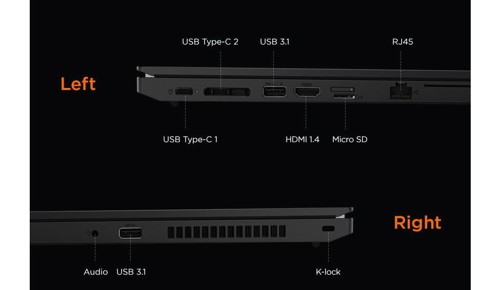 USB 3.1 포트가 2개 있고, 풀사이즈 HDMI, 마이크로 SD카드, 그리고 비즈니스 노트북 답게 유선랜 포트와 켄싱턴락을 지원합니다. 유선랜 포트가 풀사이즈로 들어있다는 것을 통해 이 노트북 두께가 얇지 않다는 것을 알 수 있습니다.