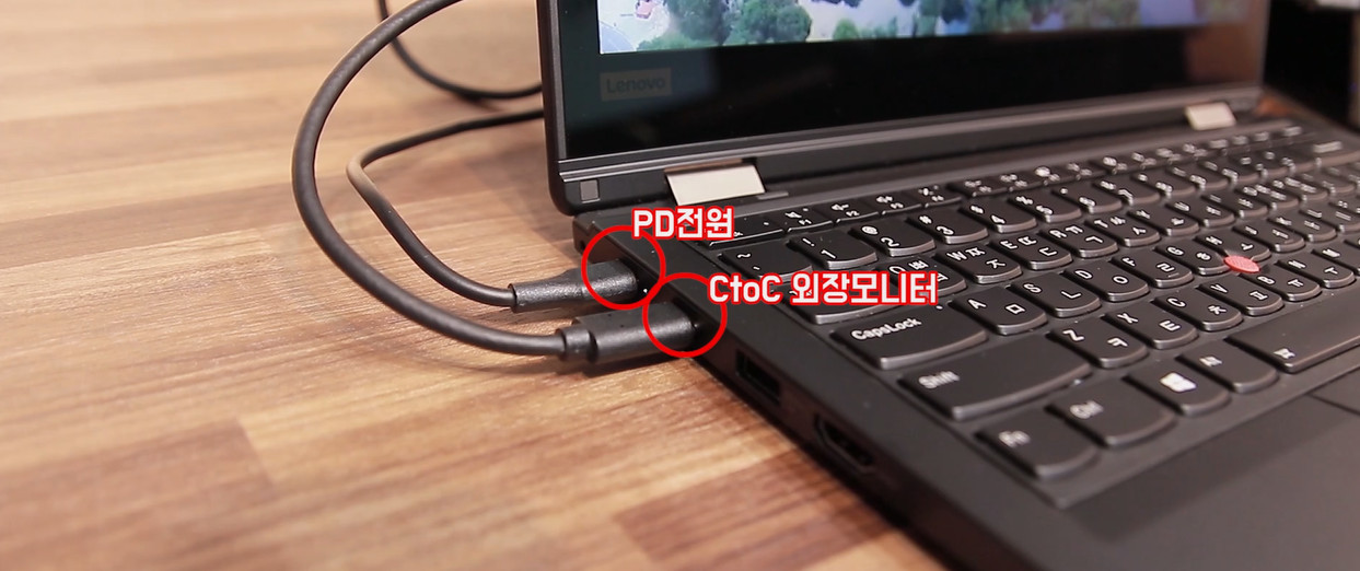 씽크패드 L라인의 최고의 장점은 PD충전 되는 멀티기능의 C타입 포트가 2개라는 점이죠. 당연히 둘 다 충전 가능합니다. 오른쪽의 C타입은 자체 규격의 레노버 도킹스테이션 위한 규격이므로 생긴 형태는 신경 쓰지 않으셔도 되고, 그냥 편하게 C타입 포트가 2개라고 생각하시면 됩니다. 이 PD충전 지원하는 C타입은 초당 전송률이 높기 때문에 사실 하나만 있어도 충분한 것은 사실이지만 사용자가 활용하는 것에 따라 아주 훌륭한 옵션이 될 수 있습니다.