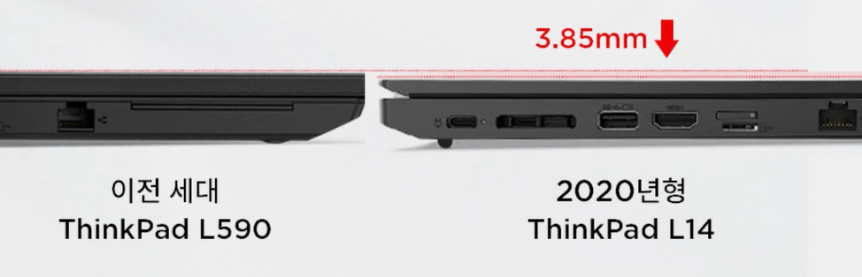 이 사진은 작년 L590과 이번 모델의 사이즈 비교를 위한 사진으로, 작년 L490, L590 모델이 두꺼운 것은 사실이고, 좀 더 슬림해 진 것도 사실입니다. 하지만 랜포트의 사이즈가 다릅니다. 비교의 극대화를 위해 L14 노트북 사진을 축소 시켜 놓은 거죠. 제가 이 사진 그대로 랜포트의 사이즈를 맞춰보겠습니다.