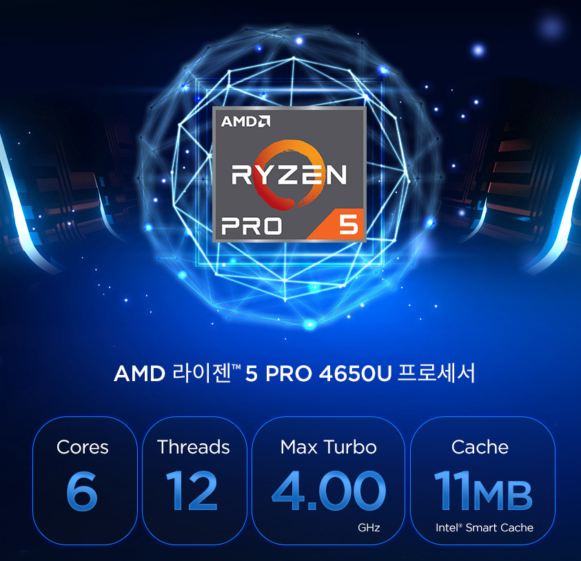 AMD라이젠5 PRO 4650U는 6코어 12쓰레드입니다. 참고로 한단계 아래의 4450U는 4코어 8쓰레드, 최고 등급의 4750U는 8코어 16쓰레드입니다. CPU에 대해서 제가 코멘트 할 중요한 부분이 있는데, 뒤 부분에서 따로 말씀드리고 지금은 가볍게 넘어가겠습니다.