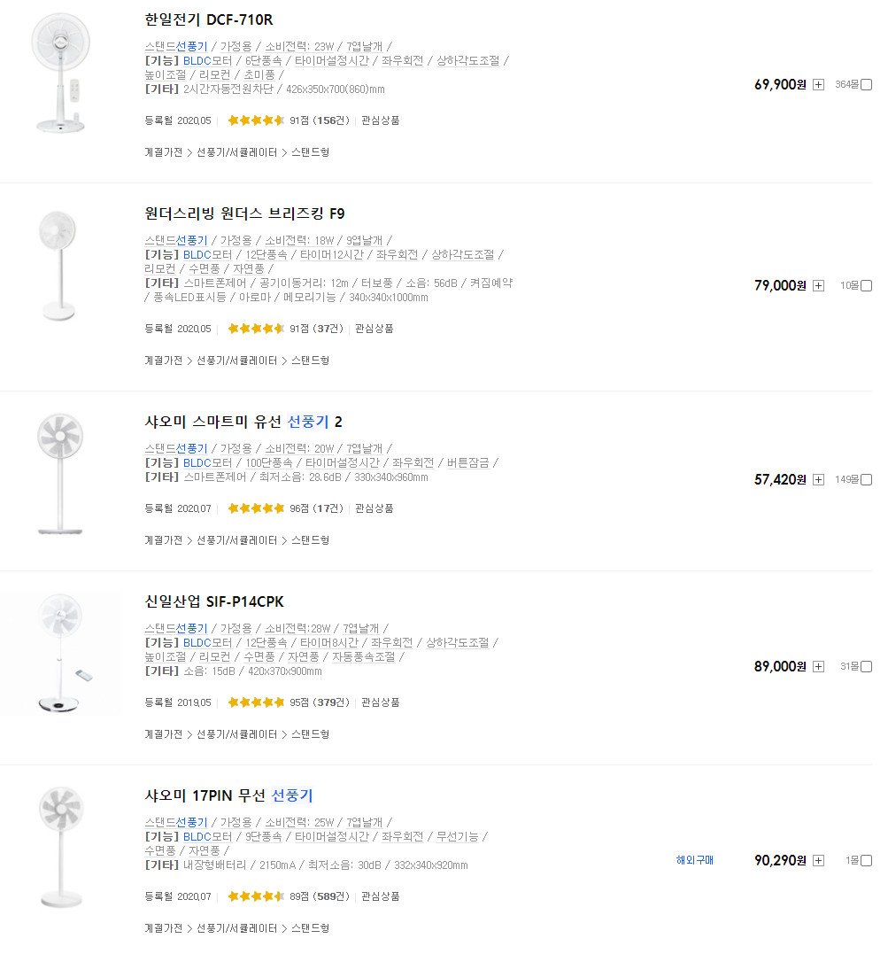 그리고 BLDC모터 선풍기들은 6만원에서 10만원까지, 선풍기 치고는 가격대가 높은 편이죠.