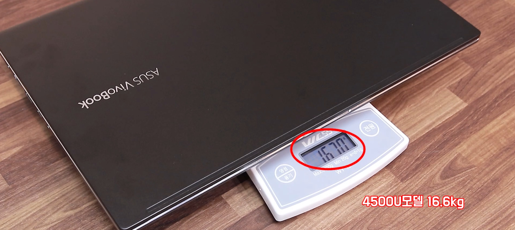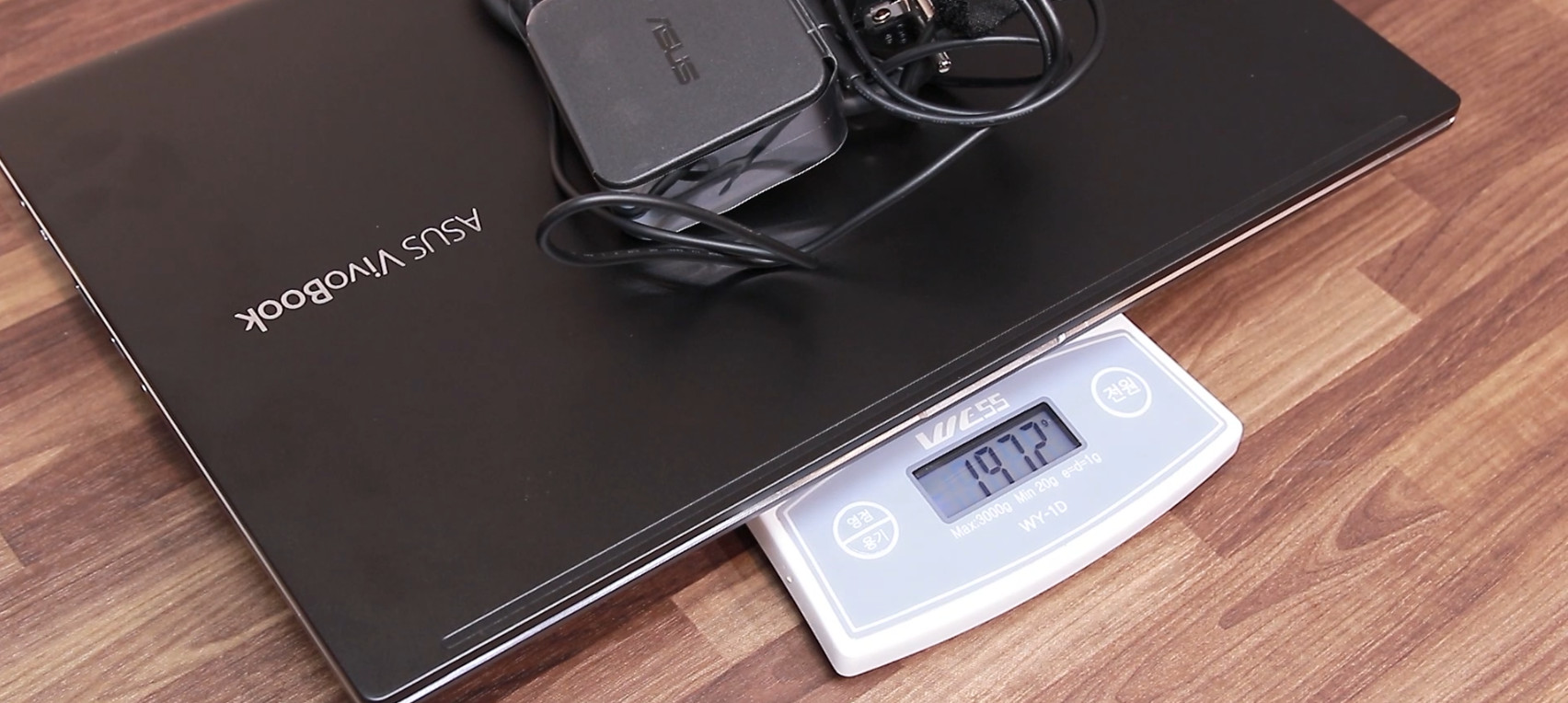 무게는 라이젠 모델과 오차범위 안에서 동일한 1.67kg 나왔습니다. 좀 더 두꺼워진 히트파이프와 MX250의 무게로 추측됩니다. 충전기 포함하면 2kg 정도로 휴대성 아주 좋습니다. 비보북은 단순히 무게 때문에 휴대성이 좋다고 말하기 보다 두께가 얇아서 실제 들었을 때 더 휴대성이 좋게 느껴집니다.
