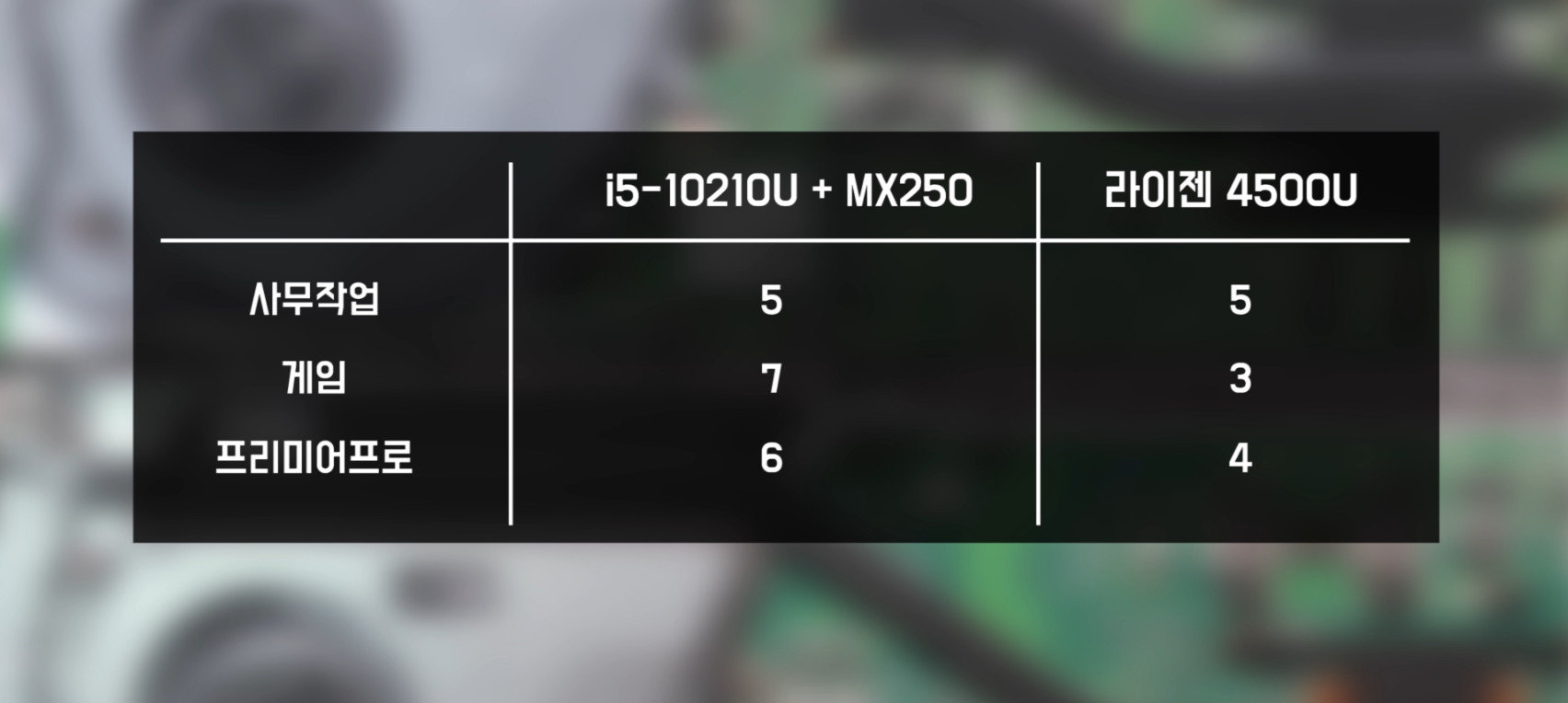 그렇다면 전반적으로 인텔이 좋다는 것이 나왔습니다. CPU때문은 절대 아니죠. MX250이라는 GPU가 달려있고, 확실히 뭔가가 더 달려있기 때문에 상대적인 비교에서 좋은 평가를 받을 수 밖에 없습니다.