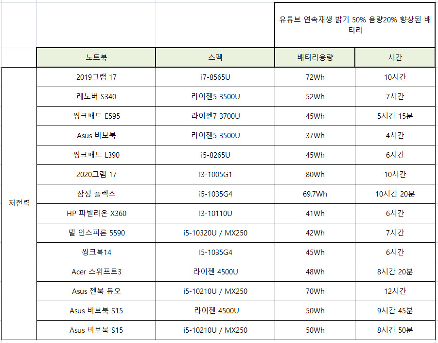 동일한 50Wh인데 라이젠 모델 대비 1시간 정도 적게 나왔습니다. 사실 8시간 50분도 잘 나온 시간이 것은 맞지만 상대적으로 조금 부족해 보이는 것이 사실입니다.