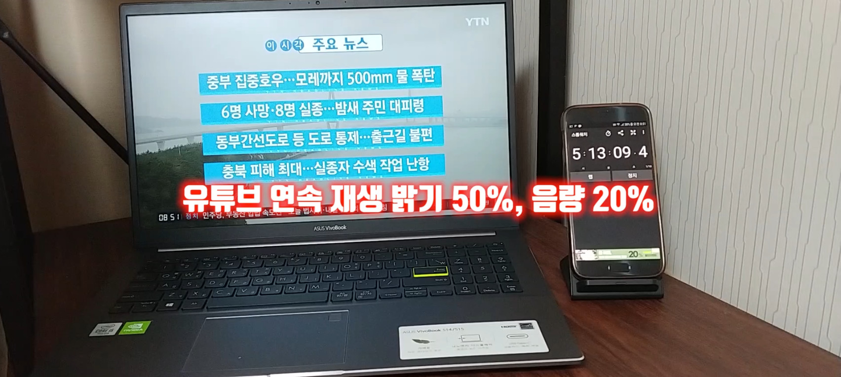 배터리 테스트는 항상 동일하게 유튜브 연속 재생 밝기 50%, 음량 20%입니다.