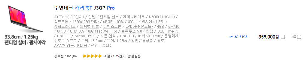 캐리북T 프로는 제미니레이크 N5000에 램4GB eMMC 64GB로 굉장히 낮은 사양의 노트북입니다. 그럼에도 불구하고 판매율이 높은 이유는 저렴한 가격에 좋은 디스플레이와 PD충전은 물론 윈도우10프로까지 포함 되어있기 때문이죠.