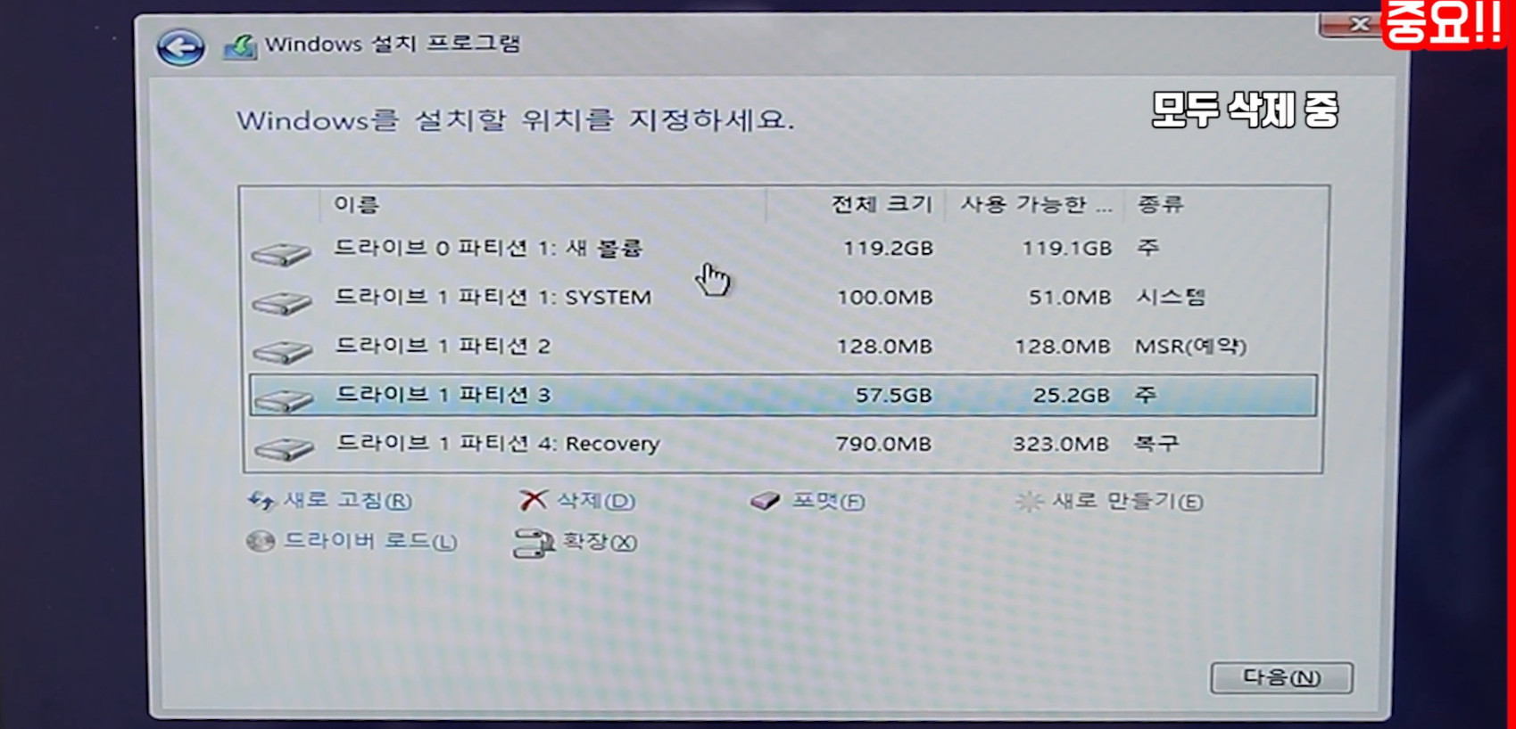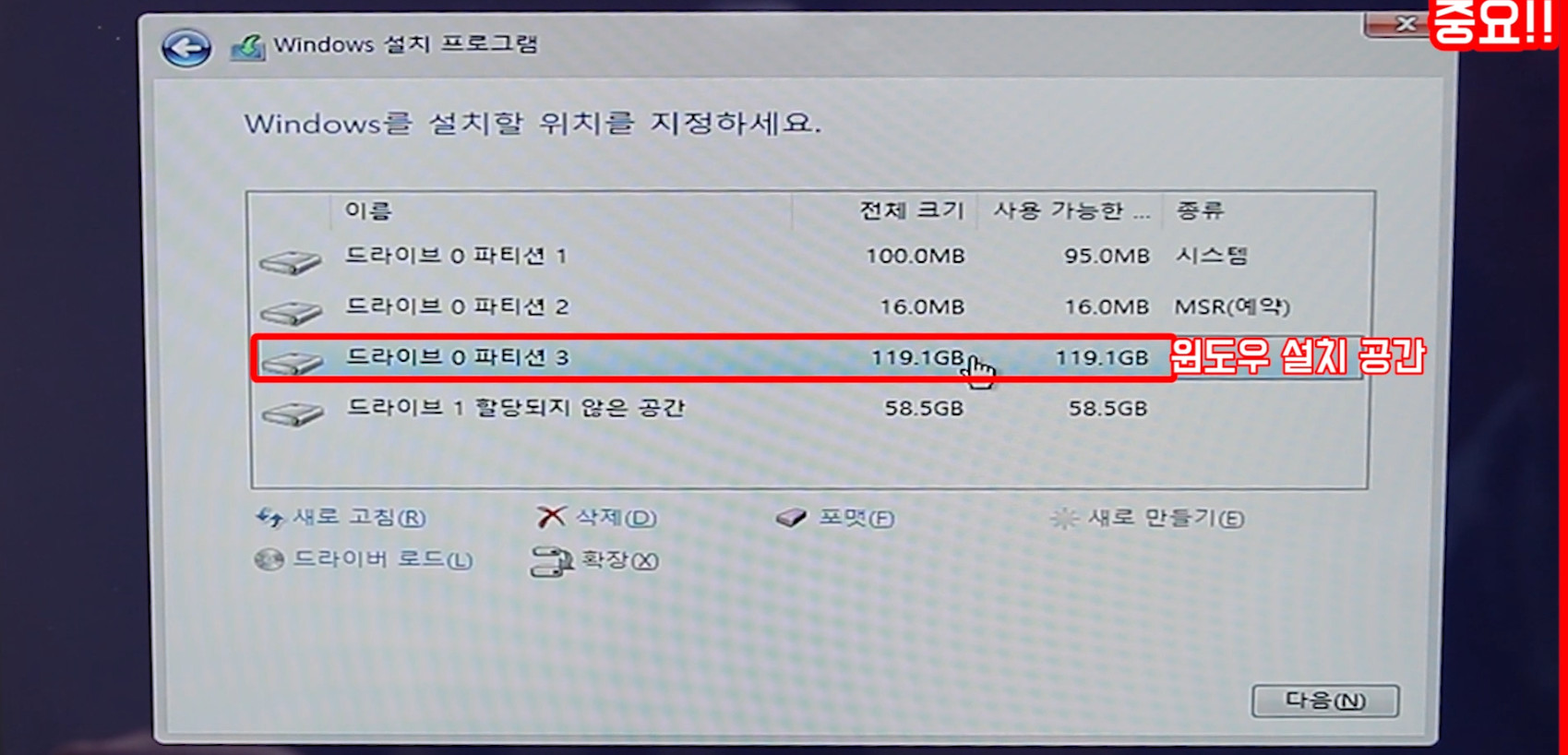 그 중 용량이 가장 큰 파티션3에 윈도우10을 설치하시면 됩니다.