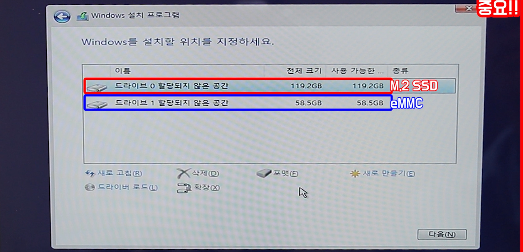 이렇게 지우면 결국 지워지지 않는 2가지가 남습니다. 보시면 119.2GB라고 적혀 있는 것이 새로 설치한 M.2 SSD, 그리고 58.5GB라고 적혀 있는 것이 느려터진 eMMC 64GB입니다. eMMC를 지금 활성화 시키면 윈도우 설치 시 헷갈릴 수 있기 때문에 건드리지 않겠습니다. 그냥 놔두세요.