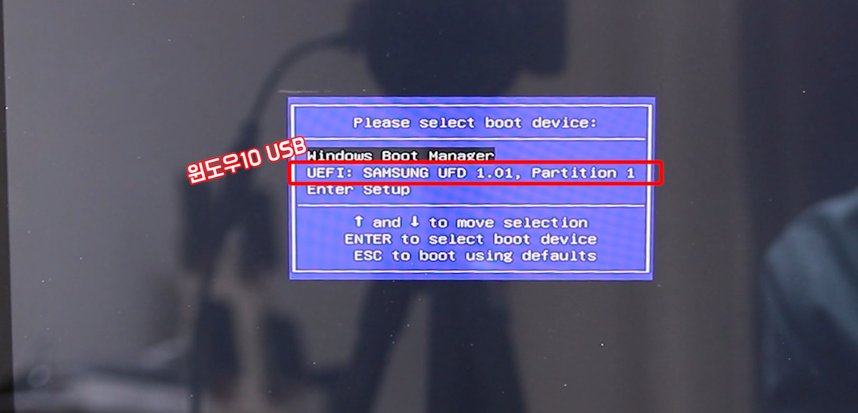 그러면 이러한 부팅선택 화면이 나오는데, USB로 설치해야 하므로 연결 된 USB을 선택해 줍니다.