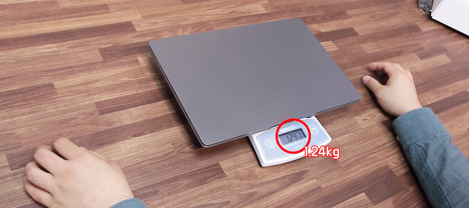 제가 직접 잰 무게는 1.24kg으로 13.3인치인 것을 감안해도 굉장히 가볍죠. 하지만 기술력이 좋아서 가벼운 것이 아닌 CPU에 맞게 냉각 시스템이 빠져 있기 때문에 가벼운 것 입니다. 일반적인 i3. i5 노트북의 무게와 1:1 비교하는 것은 아무런 의미가 없어요. 상대적인 비교를 하기에는 내부 시스템이 너무 다릅니다. 그냥 이 노트북은 13.3인치에 1.24kg으로 정말 가볍다. 휴대성 좋다 이게 끝이에요. 다른 일반적인 노트북과 비교하는 것은 의미 없습니다.