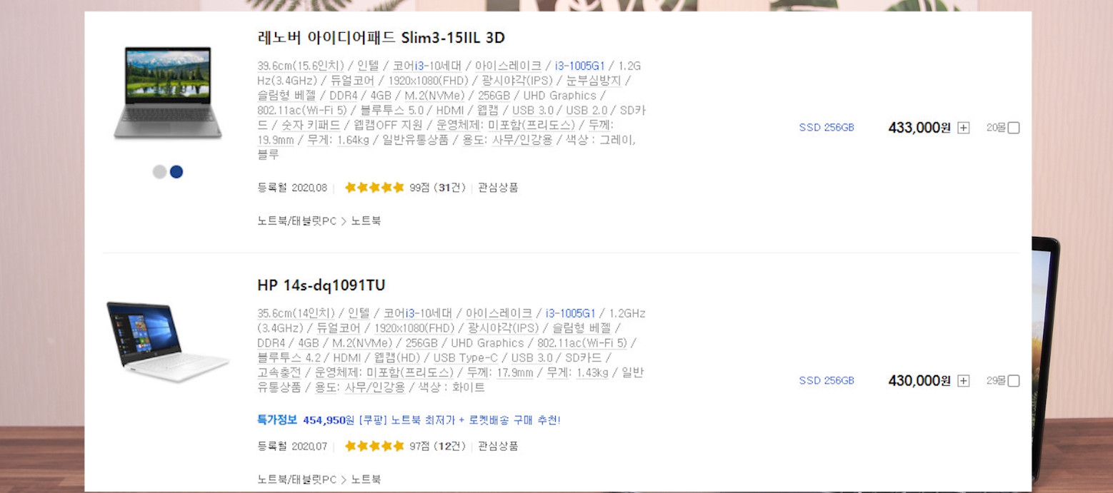 이렇게 마티즈 사러 갔다가 에쿠스 끌고 오는 상황이 여러분들에게도 올 수있기 때문에 딱 이 2가지만 고려해서 보는 것이 중요합니다. 시야를 넓히면 넓힐 수록 가격만 올라갈 뿐이죠. 이 가격으로 구매 할 수 있는 노트북은 딱 이 2가지 밖에 없습니다.