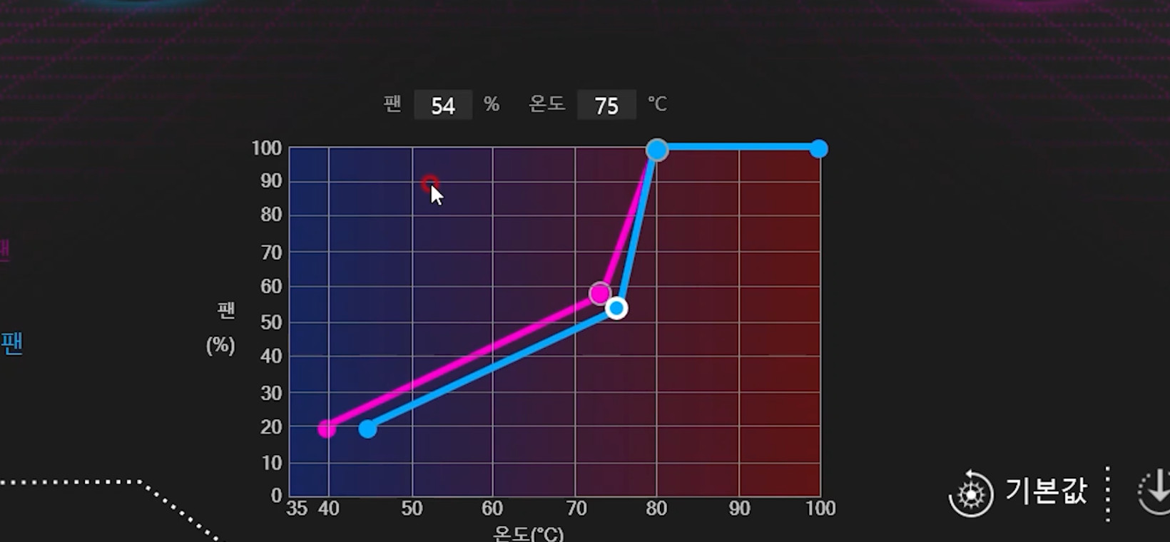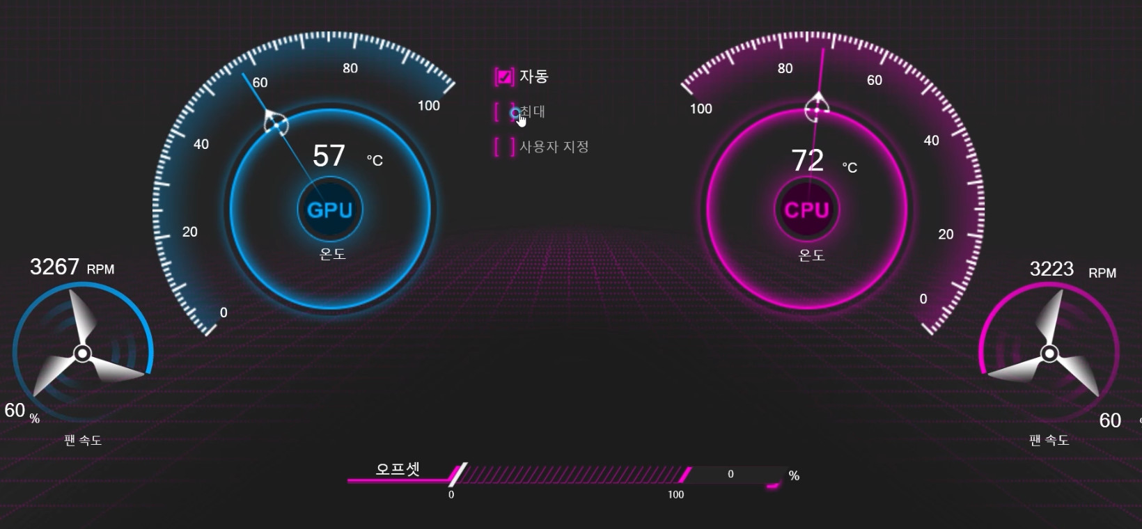 팬 속도는 저의 작업 환경에서 최적화를 맞춰보려고 노력했는데, 순간적으로 급격하게 온도가 높아지기 때문에 사용자 지정으로 설정하는 것은 큰 의미가 없더라고요. 그냥 지금은 자동 놓고 사용합니다.