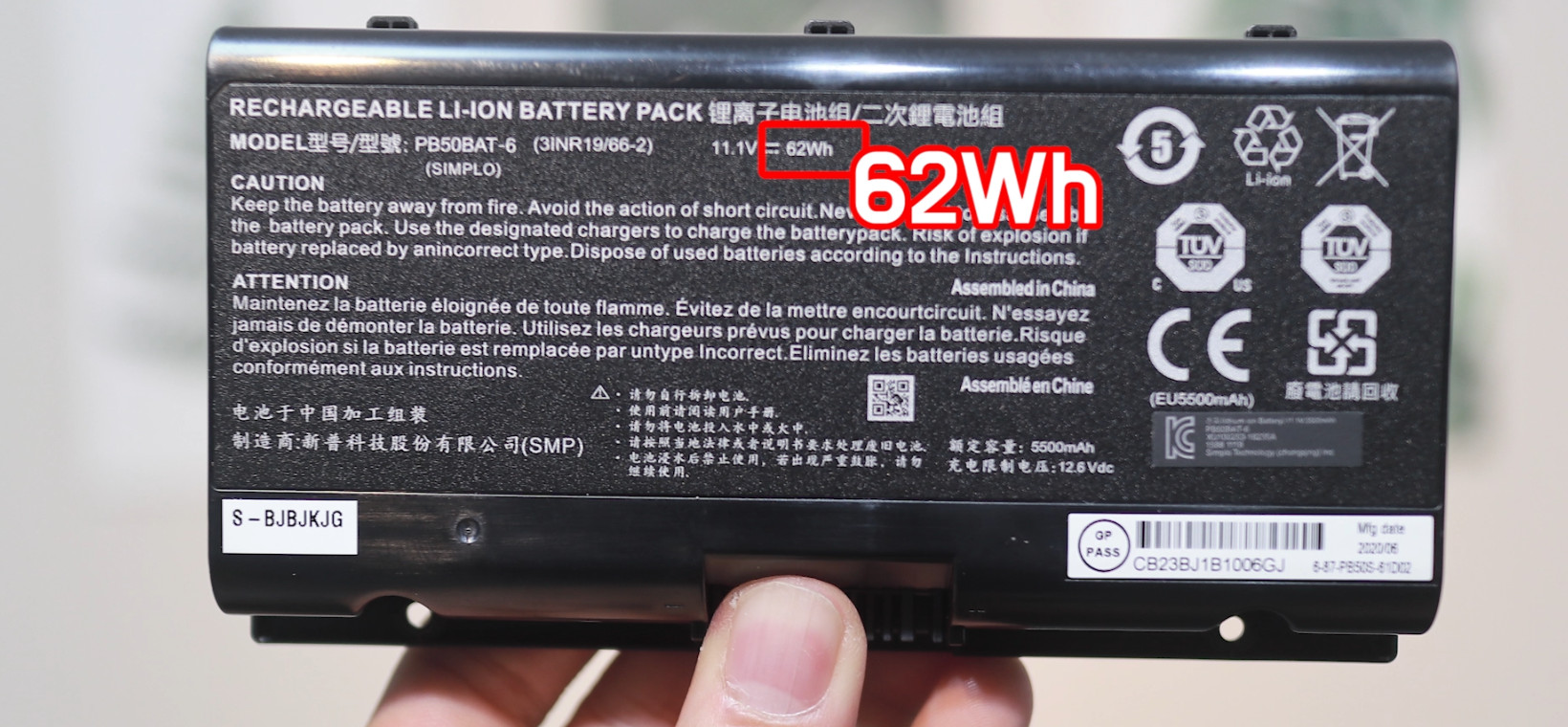 먼저 분리형 배터리가 보이네요. 원래 노트북은 전부 분리형 배터리였습니다. 그래서 교체가 수월했죠. 이 안에 18650 리튬이온 충전기가 가득 채워져 있습니다. 하지만 노트북이 전체적으로 경량화 되고, 얇아지면서 두꺼운 18650 충전기 대신 얇고 납작한 형태의 충전기를 사용하게 되었죠. 그래서 완전히 노트북 시장에서 사장 된 형태의 배터리인데, 주연테크가 부활시켰습니다. 정확히 말하면 주연테크가 이 구형 형태의 노트북을 수입해 온 거죠. 이 노트북이 휴대용 노트북이라면 말도 안되는 짓이지만 이렇게 데스크탑 대용의 고전력 노트북이라면, 그리고 가성비가 좋다면 수긍 가능한 범위라고 생각됩니다. 62Wh이고 다소 큰 용량으로 느낄 수 있겠지만 이 노트북의 전력을 봤을 때 큰 의미 없는 용량으로 배터리로만 휴대하면서 사용하는 것은 추천하지 않습니다.