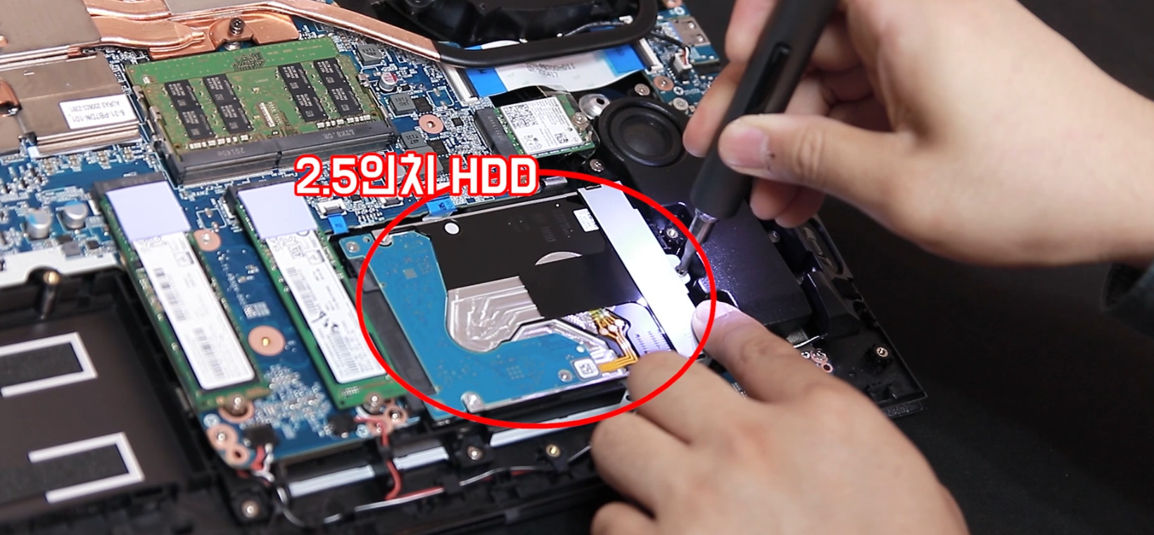 2.5인치 디스크는 그냥 나사를 잘 채결해서 단자에 맞게 물려주면 쉽게 장착 가능합니다. 보통 노트북들은 HDD의 노출되는 회로부분을 막아주는 커버가 있는데 리오나인은 그런 게 없더라고요. 하지만 하판이 플라스틱이기 때문에 문제는 없을 것으로 보입니다.