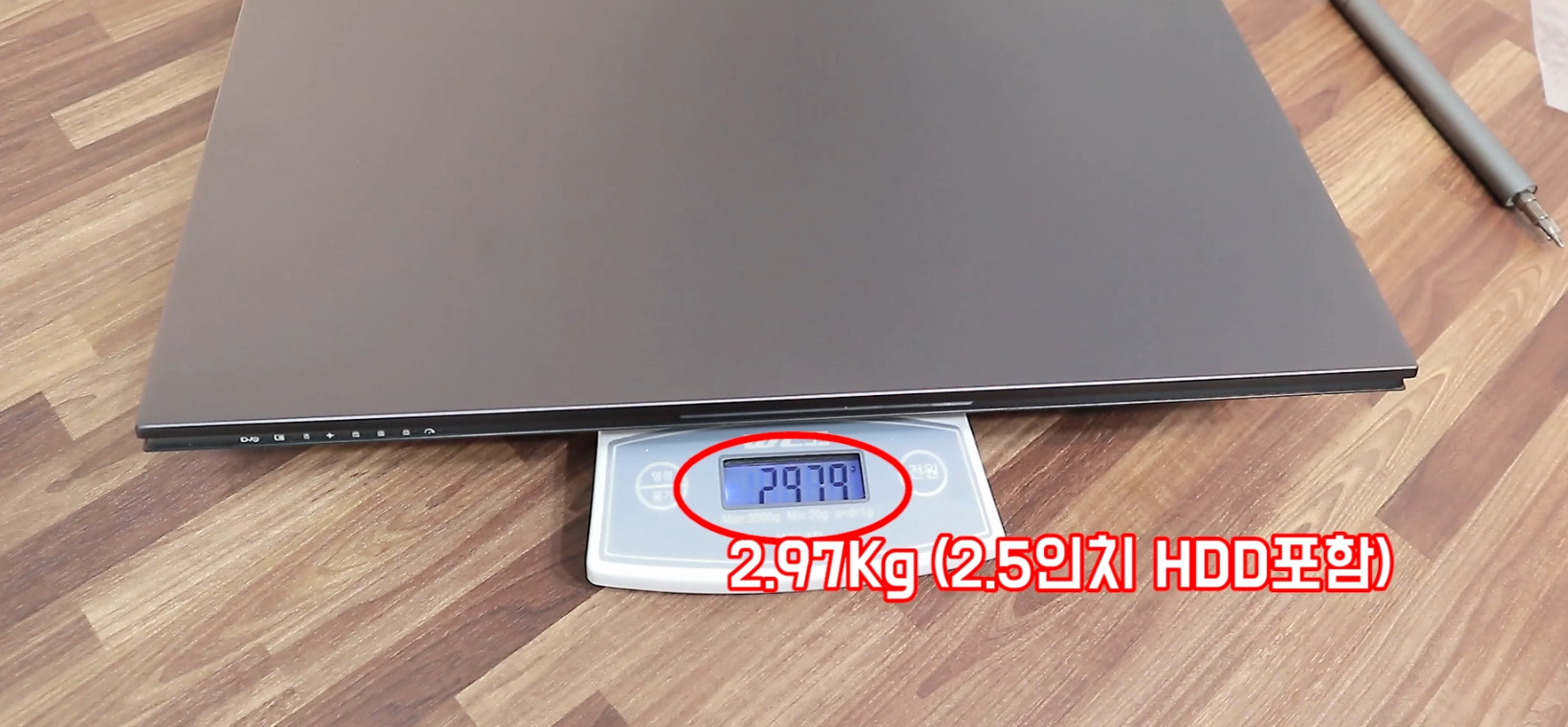 이렇게 2.5인치 HDD를 추가 장착해서 무게를 재어 보니 2.97kg이 나왔습니다. 제 저울의 최대 측정 무게가 3kg이기 때문에 충전기를 합치면 이렇게 에러가 나옵니다. 충전기만 쟀을 때는 0.8kg으로 노트북과 충전기르 합치면 3.77kg이 됩니다.