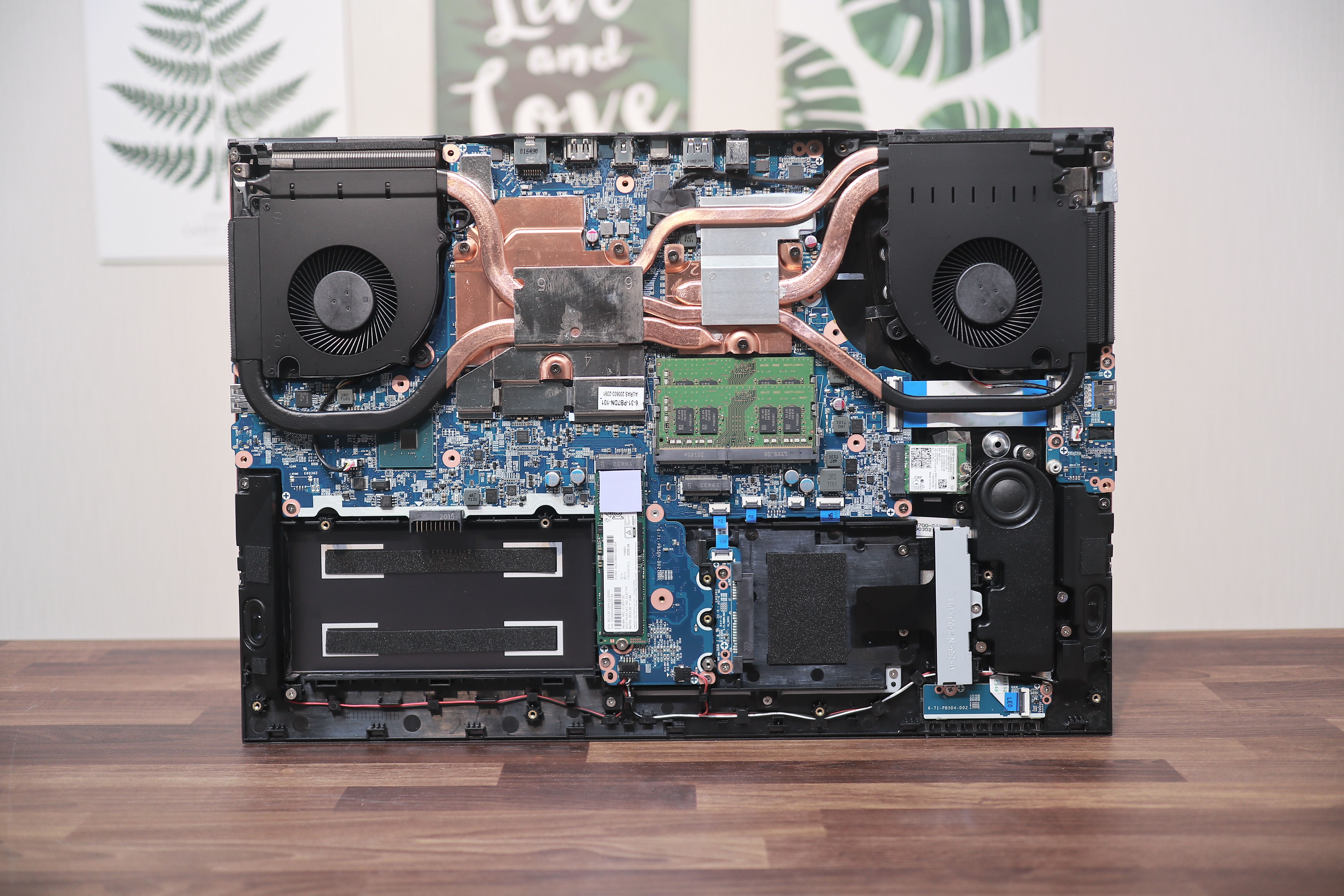 냉각 시스템은 2팬 5히트파이프로, 히트파이프가 그렇게 두껍지는 않고 배기구는 총 4개가 있습니다. 히트싱크도 4개가 있죠. 경량화 되지 않은 고사양 노트북들은 보통 이정도의 냉각 시스템을 갖습니다. 구조 자체는 그냥 무난하다고 볼 수 있죠. 보통 노트북 리뷰할 때 "냉각 시스템이 무난해 보입니다"라고 말하면 좋은 편에 속하는 걸로 볼 수 있는데 이 노트북은 인텔 10세대 고성능 CPU가 이미 뜨겁기로 정평이 나 있고, 그래픽카드는 125W의 고출력 고성능 GPU입니다. 무난한 냉각 시스템으로는 힘들죠. 물론 노트북의 사이즈와 두께로 인해 냉각 시스템 탑재에 한계가 있습니다. 그래서 고사양 노트북들은 사양을 올리는 것 보다 CPU와 GPU 자체의 발열을 해결하는 것이 더 중요하죠. 쉽게 말해 노트북 제조사들이 할 일이 아닌, CPU GPU 제조사들이 할 일이라고 보는 것이 더 맞습니다. 우리가 더 정밀한 공정의 CPU를 선호하는 이유이기도 하죠.