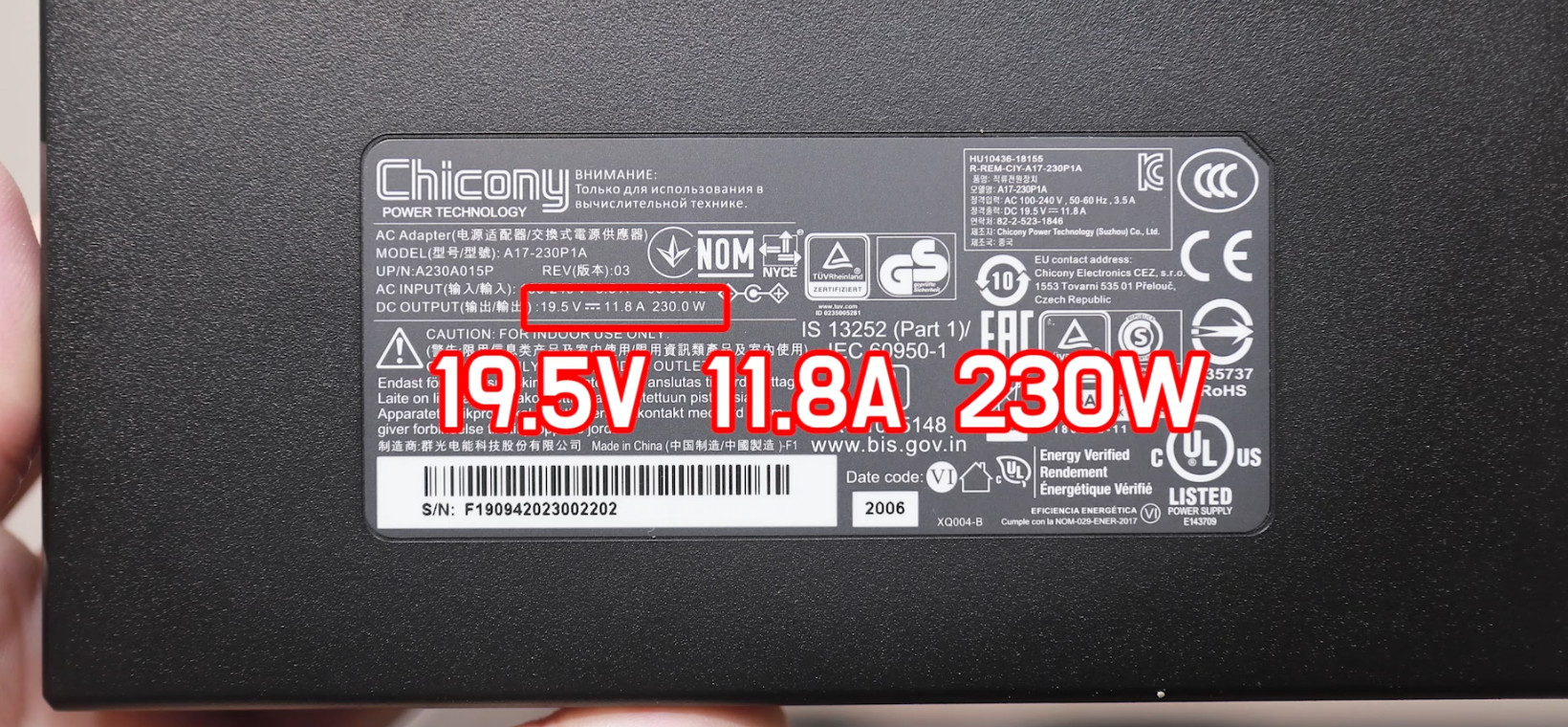 19.5V에 11.8A, 230W로 노트북 치고는 높은 최대 전력입니다. 하지만 그래픽카드의 전력은 높아도 결국 CPU자체는 노트북용 CPU이기 때문에 최대 전력 사용량은 동급 데스크탑에 훨씬 못 미칩니다. 물론 성능도 훨씬 못 미치죠.