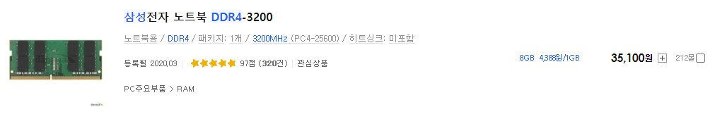 DDR4 3200MHz의 대역폭을 지원하고 구매하실 때 필히 3200MHz의 램을 구매하세요. 저는 삼성 제품 8GB로 구매했습니다. 4300U나 4500U 구매하신 분들은 저렴한 4GB만 설치하셔도 충분합니다.