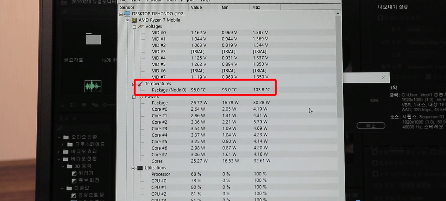하지만 온도가 쭉쭉 올라가고, 인코딩시 발열구 부분에서 높은 온도를 느낄 수 있습니다. 큰 문제라고 생각되지 않는 이유는 인코딩이 끝나면 다시 안정적으로 온도가 내려가기 때문이죠. 영상편집에 있어서 인코딩이라는 것은 결과의 행위이기 때문에 굳이 문제 삼을 필요는 없다고 봅니다. 인코딩 많이 해봤자 하루에 한 번입니다. 영상편집 하는 동안은 굉장히 안정적인 온도를 보여주기 때문에 불편함은 없습니다.