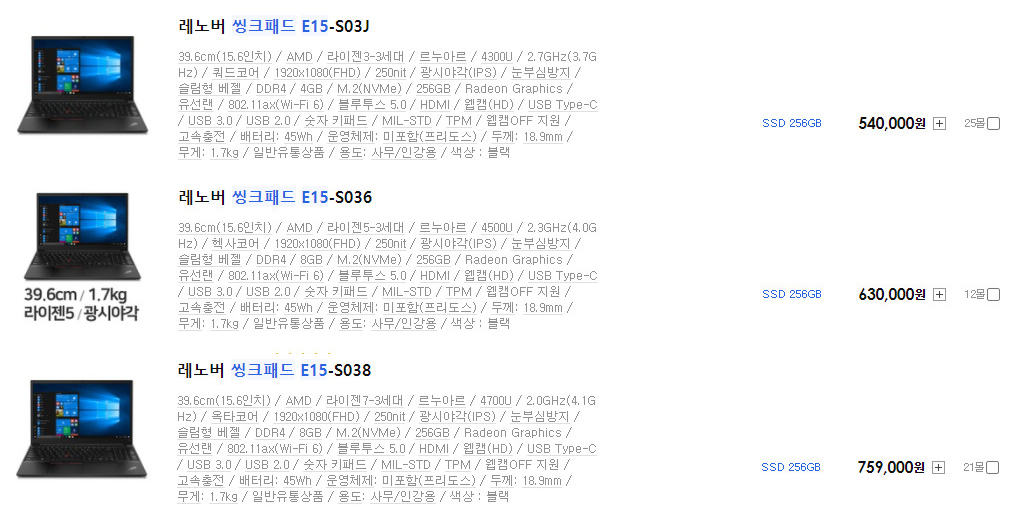 저는 E15 4700U 모델을 거의 할인 없이 76만원 정도에 구매했습니다. 이 제품은 꾸준히 할인을 하고 있으니 검색을 하면 좀 더 저렴하게 구매하실 수도 있습니다.