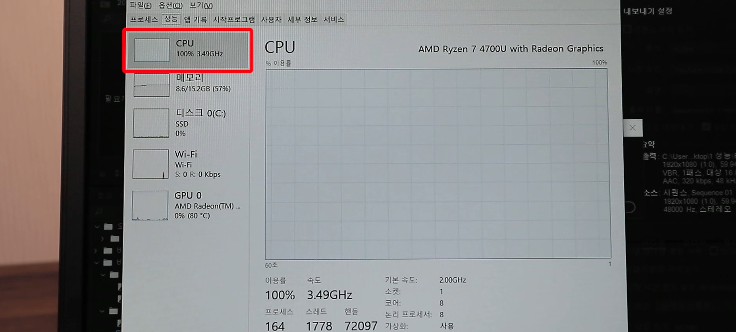 인코딩 할 때는 CPU를 100% 사용하는데, 역시나 무소음에 가깝습니다. 신기할 정도로 팬소음이 나지 않아요.