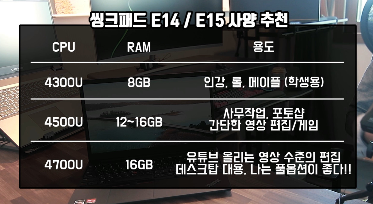 먼저 인강 듣는 학생들, 나는 어린 학생이지만 비즈니스 노트북을 맛 보고 싶다. 미래에 나는 씽크패드를 들고 출장을 나가야하기 때문에 미리 그 느낌을 알고 싶다. 이러한 학생분들은 4300U 구매하세요. 그리고 램 업그레이드 하지 마세요. 그대로 사용하시면 됩니다. 먼저 인강 듣고 온라인 강의 듣는데 아주 충분하고, 굳이 듀얼 채널 램 사용하지 않아도 롤 정도는 장시간 돌릴 수 있습니다. 그대신 너무 막 이것저것 프로그램을 설치하지 말고 인강, 온라인 수업, 롤, 메이플 정도로 용도를 정확히 정해서 사용하면 전혀 문제가 없습니다.