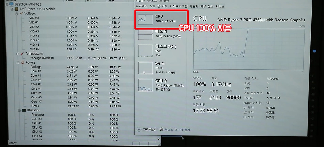 제가 프리미어프로로 만드는 10분 가량의 FullHD수준 영상은 당연히 무리 없이 만들 수 있고, 포토샵 작업도 아주 원활하게 가능합니다. 게임도 큰 발열 없이 장시간 진행 가능합니다. 물론 최신 고사양 게임은 아무리 좋은 4750U라도 결국 저전력 CPU이기 때문에 장시간 플레이는 노트북에 무리를 줄 수 밖에 없습니다. 8코어 16쓰레드의 이 CPU는 결코 게임을 위한 CPU가 아닙니다. 상대적으로 좀 더 잘 될 뿐이죠.