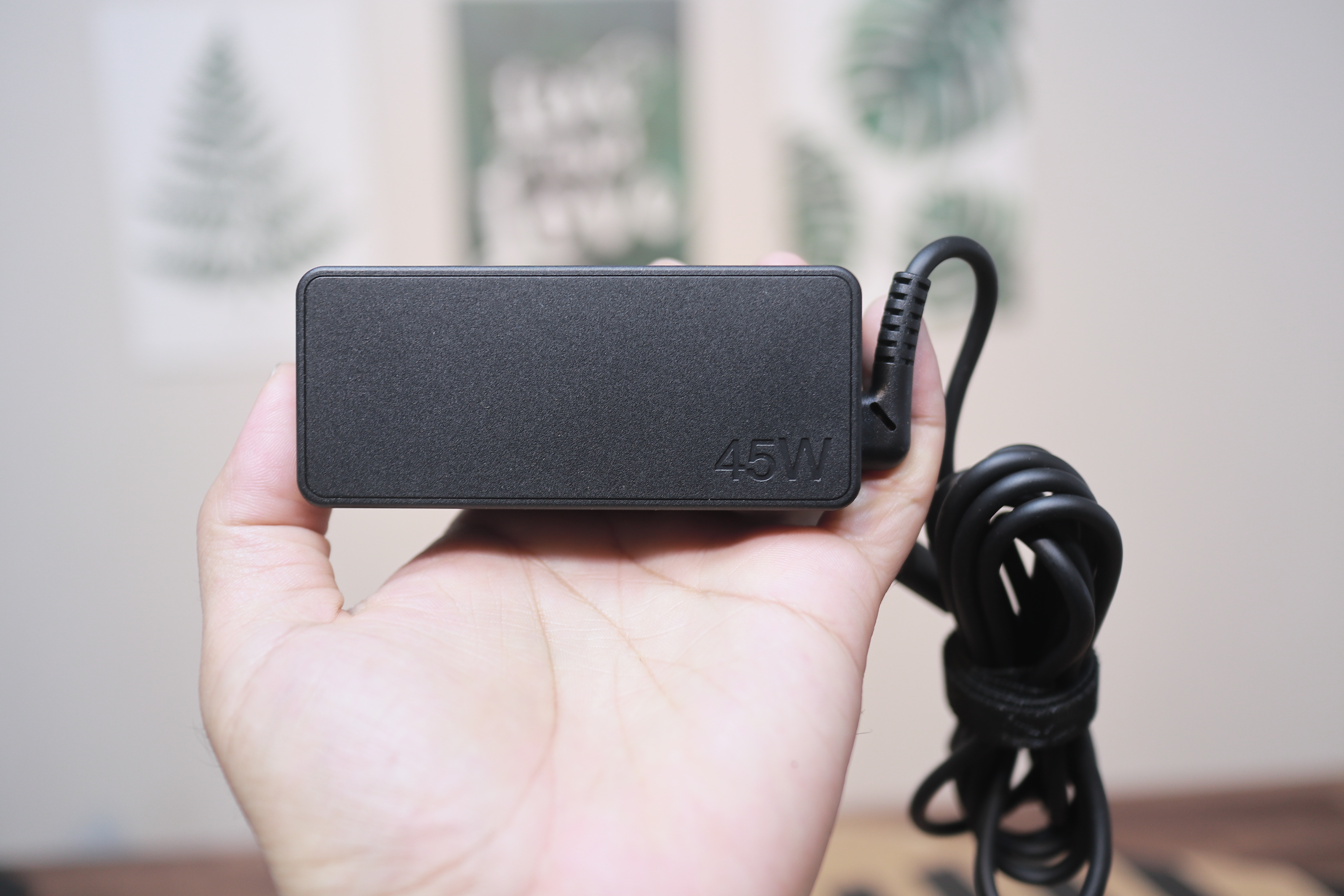 먼저 충전기는 접지형 C타입으로 45W입니다. 작년 모델은 65W였는데 오히려 다운그레이드 되었습니다. 당연히 단점으로 볼 수 있습니다. 45W는 65W 충전기 대비 충전 시간도 느리지만, C타입 멀티 허브 사용했을 때 출력이 부족할 수도 있습니다. 이 부분은 굉장히 좋지 않은 단점으로 봅니다.