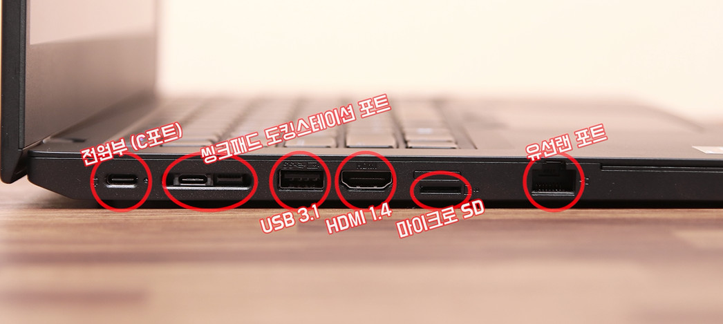 왼쪽에는 전원부로 사용하는 C포트와 씽크패드 전용 도킹스테이션 포트, USB 3.1, HDMI 1.4, 마이크로 SD카드 슬롯, 유선랜 포트가 있습니다.