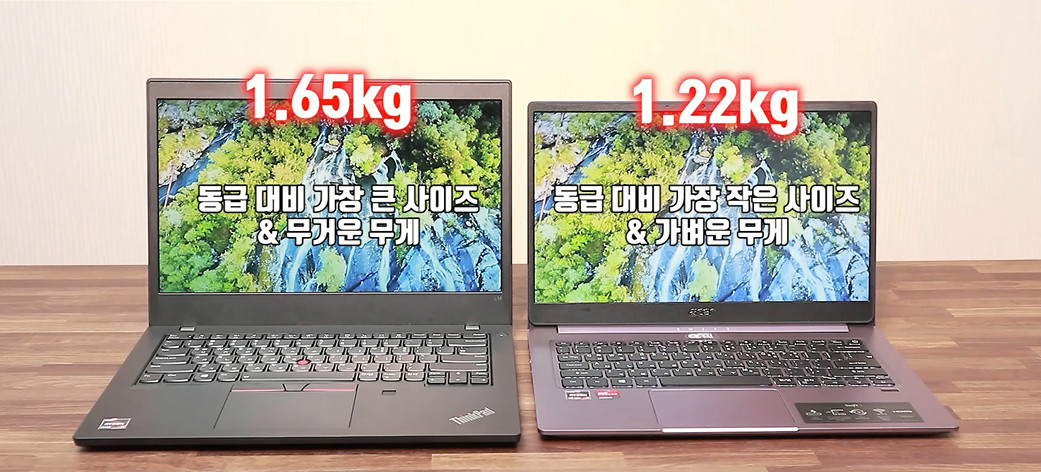 먼저 씽크패드 L14는 동급 대비 가장 큰 사이즈와 무거운 무게를 가졌고, 스위프트3는 동급 대비 가장 작은 사이즈와 가벼운 무게를 가졌습니다. 같은 시대에 같이 나온 노트북이라고 생각되지 않을 정도로 휴대성에서 차이가 납니다. 배터리 타임 역시 스위프트3가 더 좋기 때문에 휴대성의 차이는 더 벌어지죠. 휴대성은 동급 최고라고 볼 수 있고, 앞으로도 보급형 라인에서 스위프트3 보다 좋은 휴대성을 가진 노트북이 나오기는 힘듭니다. 휴대성만큼은 프리미엄 라인으로도 볼 수 있습니다.