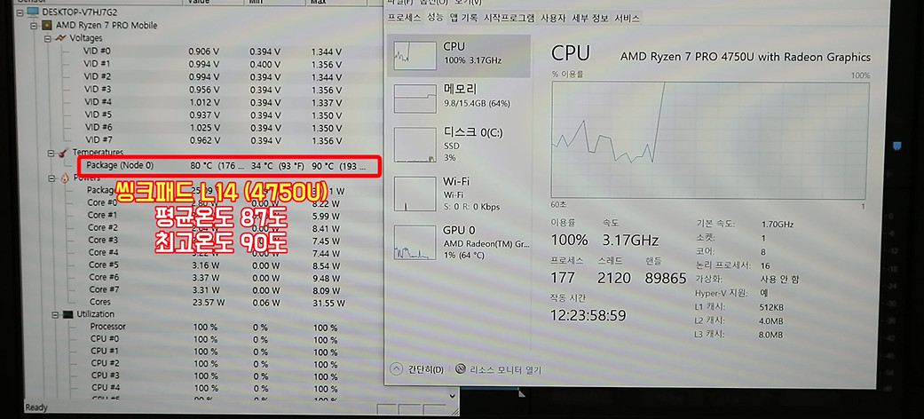 전력을 충분히 사용하면서 성능도 잘 나오지만 온도는 80도 정도도 비교적 안정적으로 나옵니다. 최대 온도가 90도를 넘지 않아요. 최대 온도 100도를 넘기고, 평균 온도 90도를 가볍게 넘기던 E15의 4700U 대비 훨씬 안정적인 온도를 보이고 있습니다.