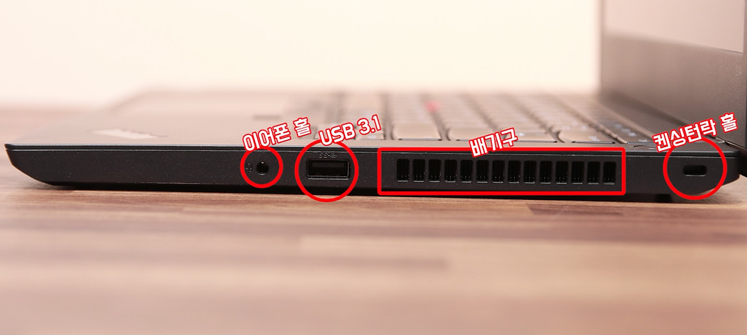 오른쪽에는 켄싱턴락홀, 배기구와 USB3.1, 이어폰홀이 있고,