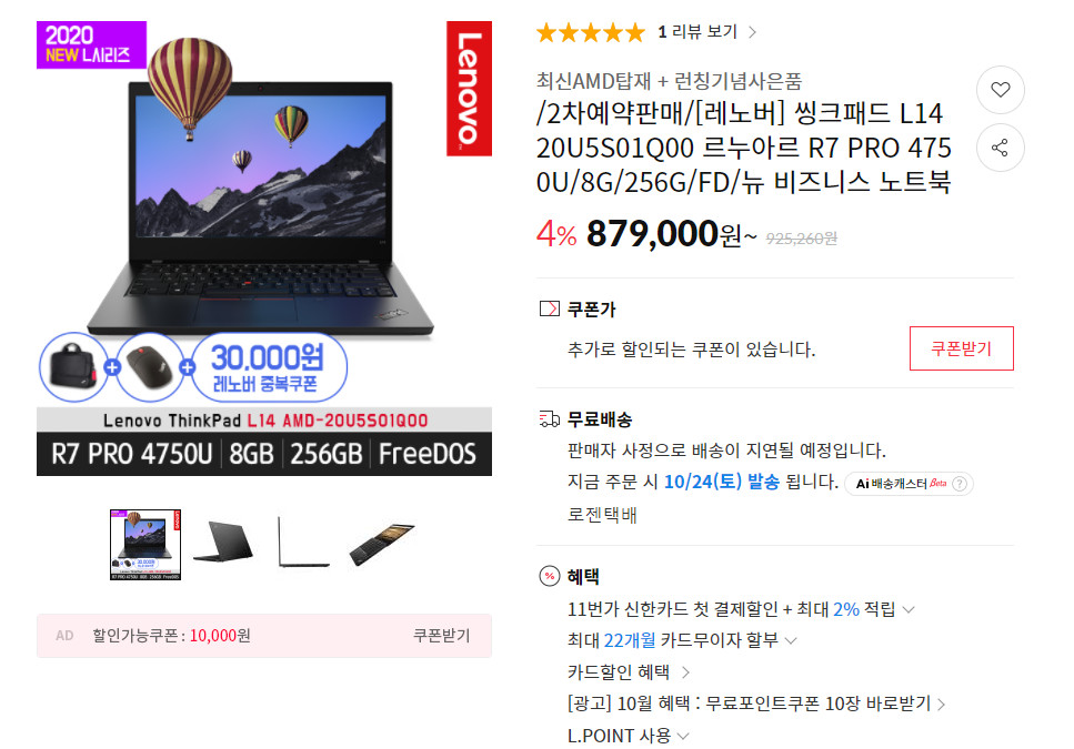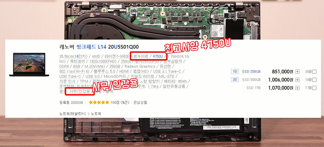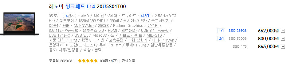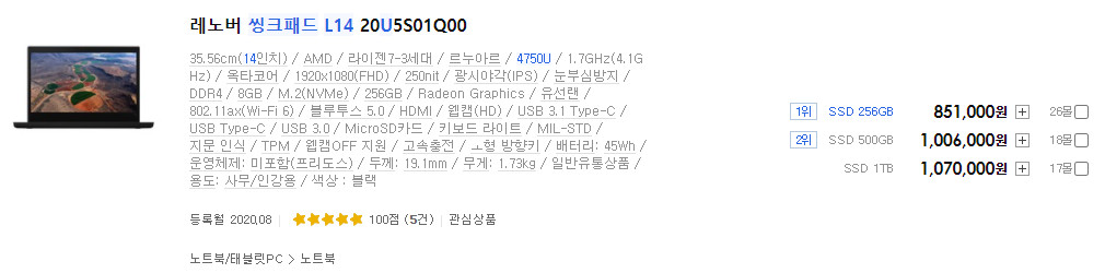 저는 L14 최고사양인 4750U 모델을 할인 받아서 70만원 정도에 구매했습니다. 운이 좋아 굉장히 저렴하게 구매했지만, 할인 받지 않았다면 굳이 4750U를 구매하지 않을 것 같습니다. 이 부분은 뒤에서 따로 설명 드리겠습니다.
