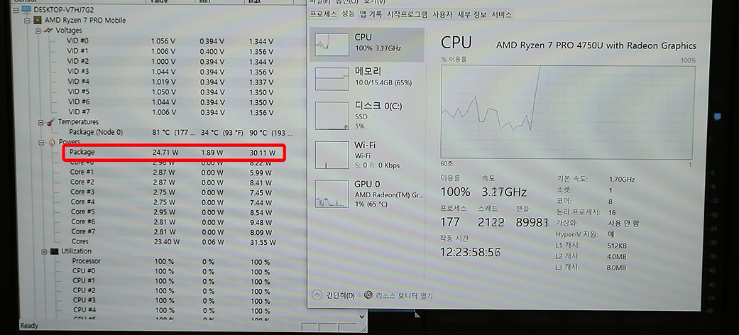 배터리 시간에 많이 실망했습니다. 라이젠 PRO CPU의 배터리 효율이 너무 좋지 못해요. 성능이 높기 때문에 배터리 효율이 떨어진다고 생각할 수 있겠지만, 지금 제가 테스트 한 상황은 그냥 단순 유튜브 재생으로 사무작업에 들어가는 사용범위죠. 아무리 성능이 좋아도 저전력 CPU이기 때문에 사무작업에서 긴 배터리 시간이 나와줘야 사용성이 높아집니다.