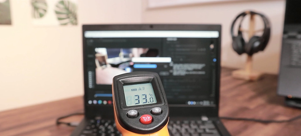 노트북의 표면 온도는 전체적으로 안정적입니다. 하지만 발열구 부분은 45정도로 꽤 높게 나옵니다. 마우스 사용을 발열구 바로 옆에서 하면 충분히 따뜻함이 느껴집니다.
