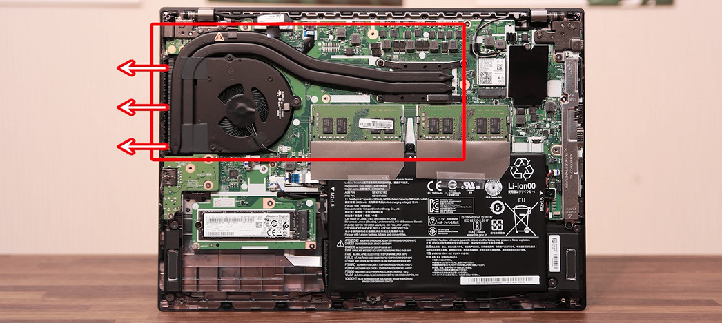일반전인 저전력 노트북들의 후면 배기가 아닌 측면 배기로 되어있습니다. 측면 배기를 하면 히트파이프를 좀 더 길게 가져갈 수 있어서 냉각에 도움 되는 부분은 있겠지만 배기의 위치가 그렇게 좋지는 않습니다.