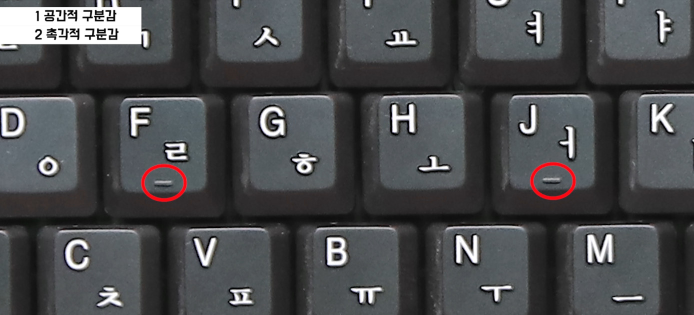 방금 말한 내용은 키보드에서 가장 중요한 "공간적 구분감"이고, "촉각적 구분감"도 있습니다. 보시면 모든 키보드의 F키와 J키에는 미세하게 돌기가 돌출되어 있는데