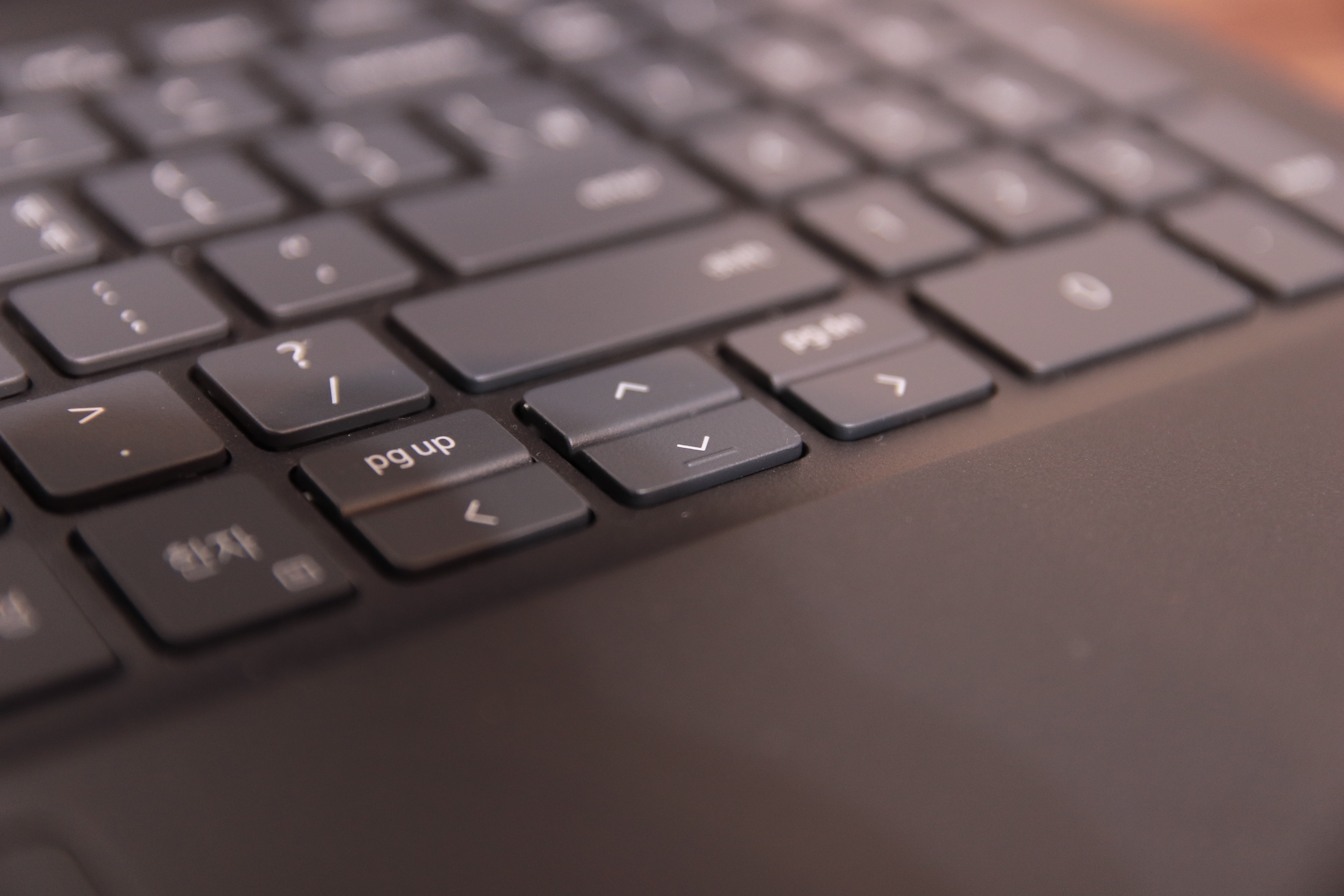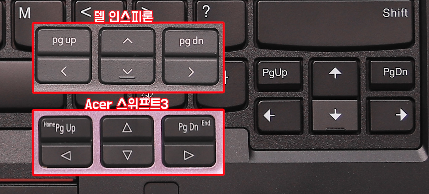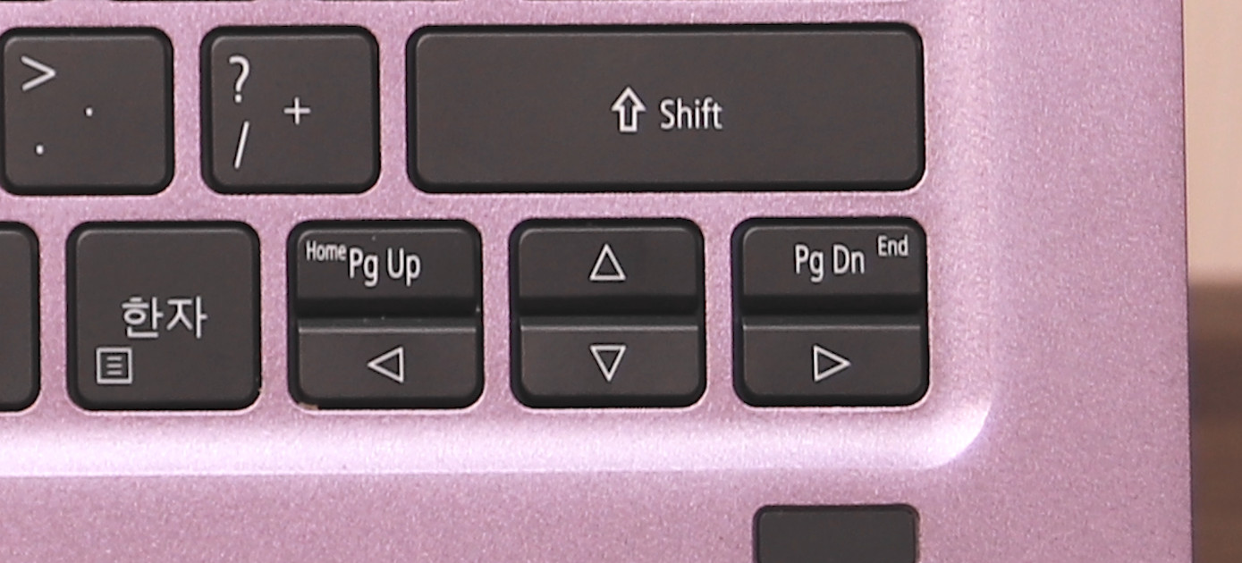 사무작업에 최적화 된 노트북들이 보통 방향키 위에 페이지 업, 페이지 다운 키를 넣습니다. 이렇게 구성 되면 다소 구분감이 불편하게 느껴질 수 있으나 잘 보시면 이 마저도 공간을 두어 구분감을 주고 있습니다.