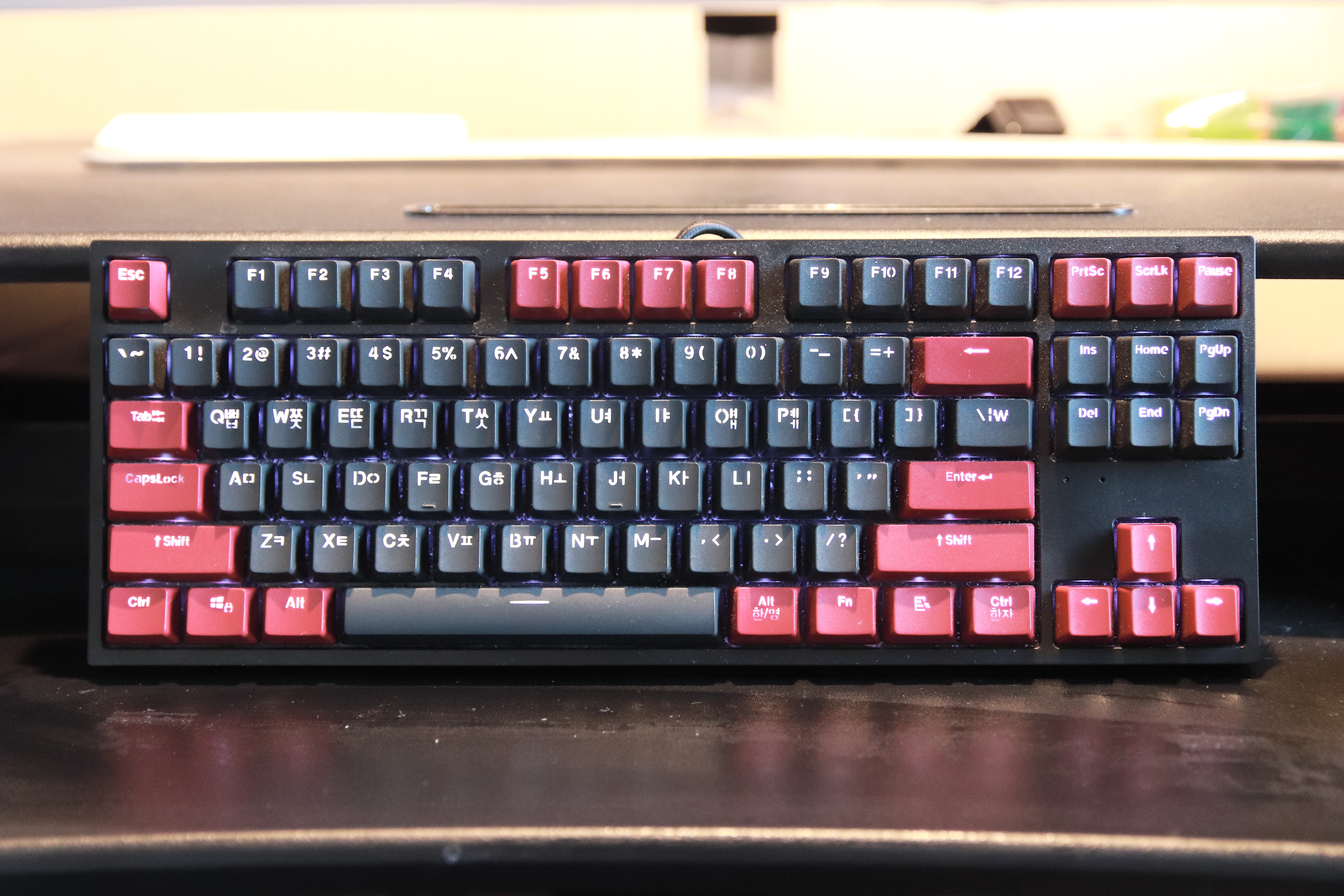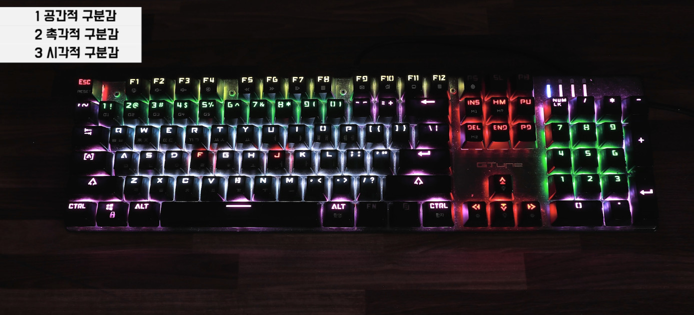 제가 사용하는 기계식 키보드는 LED의 색상으로 구분감을 줬습니다. 문자는 흰색, 숫자는 녹색, 이런식으로 시각적 구분감을 주면 오타율을 낮출 수 있죠.